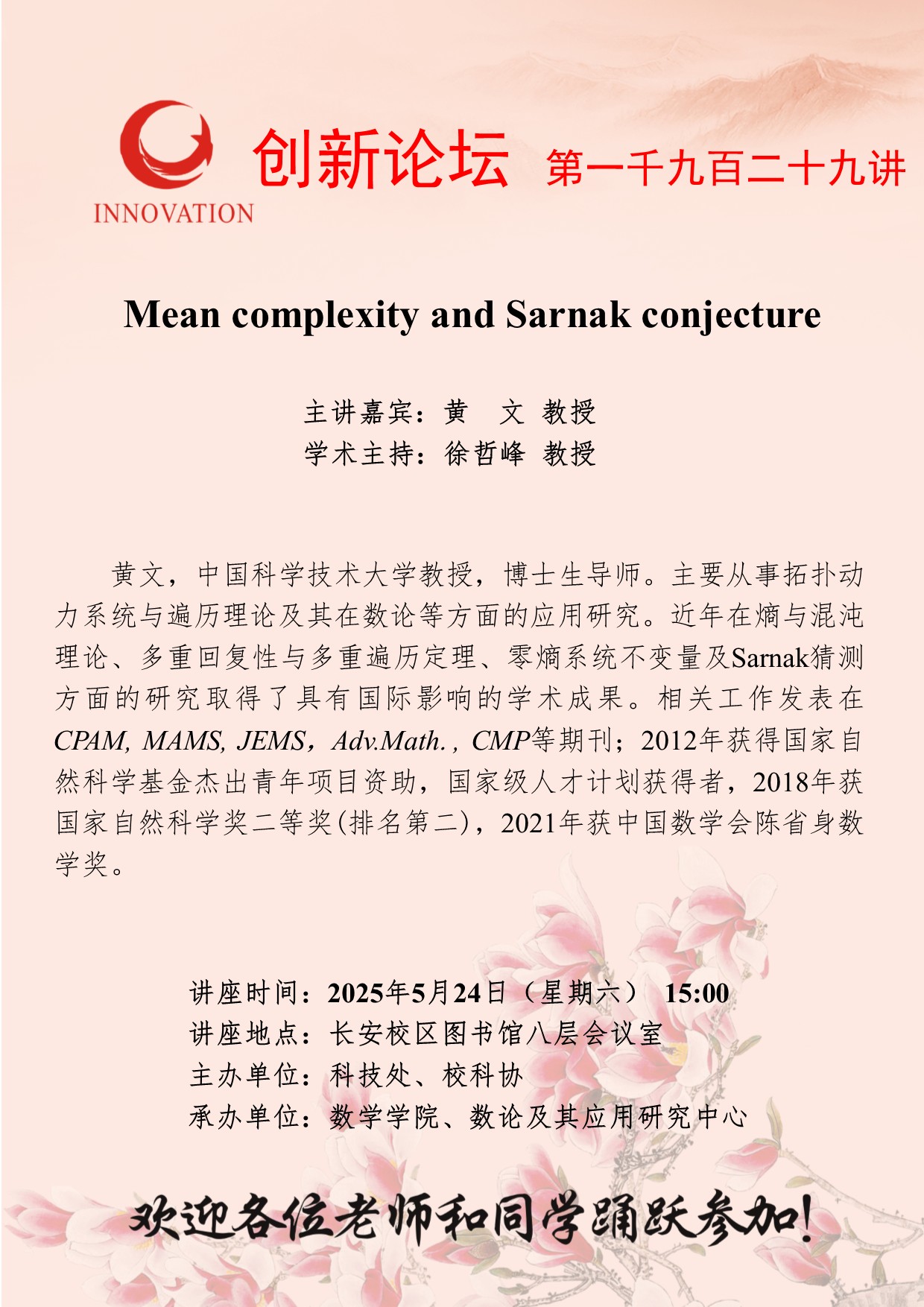 黄文 教授 九游会在线登录官网创新论坛第一千九百二十九讲:Mean complexity and Sarnak conjecture 讲座时间 2025年5月24日(星期六) 15:00 讲座地点 长安校区图书馆八层会议室 讲座人介绍 黄文 教授 讲座内容