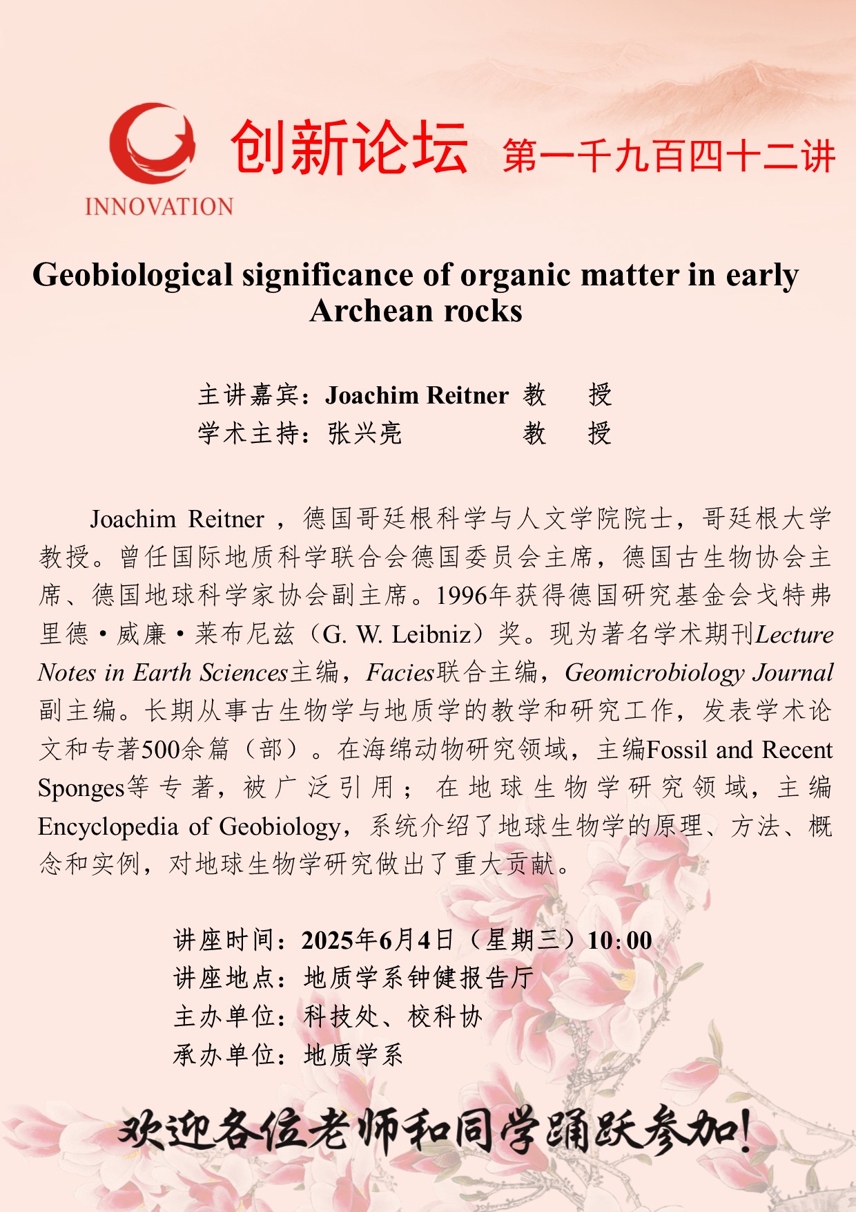 Joachim Reitner 教授 九游会在线登录官网创新论坛第一千九百四十二讲:Geobiological significance of organic matter in early Archean rocks 讲座时间 2025年6月4日(星期三)10:00 讲座地点 地质学系钟健报告厅 讲座人介绍 Joachim Reitner 教授 讲座内容