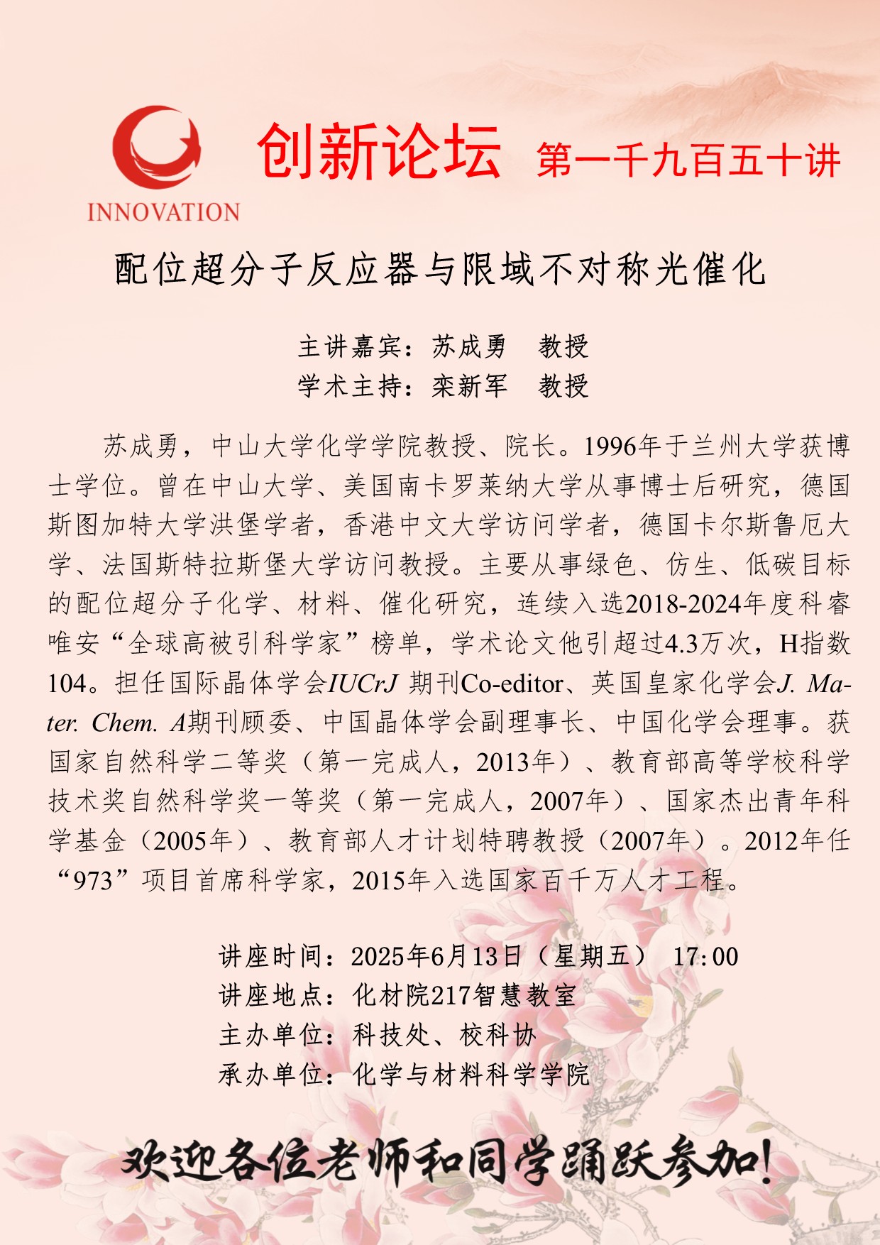 苏成勇 教授 九游会在线登录官网创新论坛第一千九百五十讲:配位超分子反应器与限域不对称光催化 讲座时间 2025年6月13日(星期五) 17:00 讲座地点 化材院217智慧教室 讲座人介绍 苏成勇 教授 讲座内容