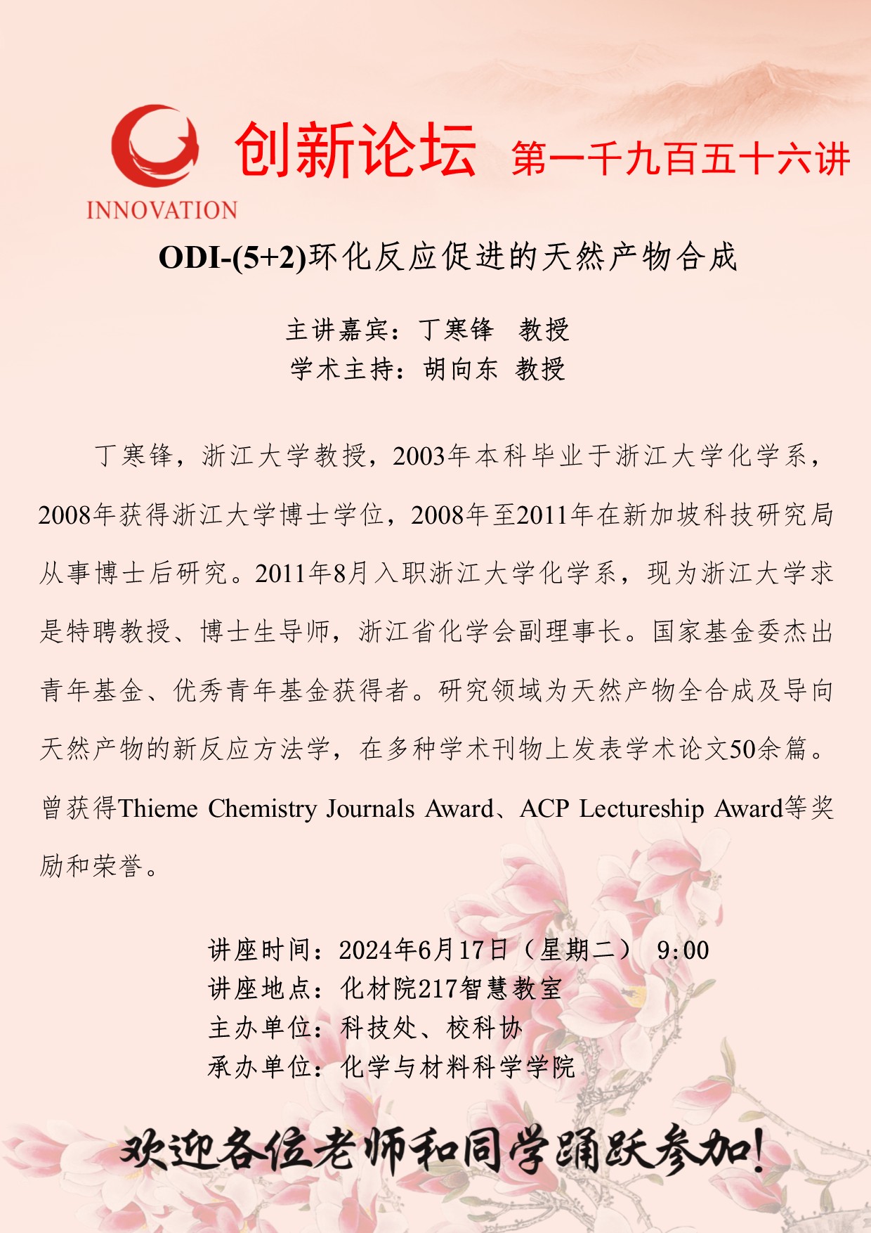 丁寒锋 教授 九游会在线登录官网创新论坛第一千九百五十六讲:ODI-(5+2)环化反应促进的天然产物合成 讲座时间 2024年6月17日(星期二) 9:00 讲座地点 化材院217智慧教室 讲座人介绍 丁寒锋 教授 讲座内容