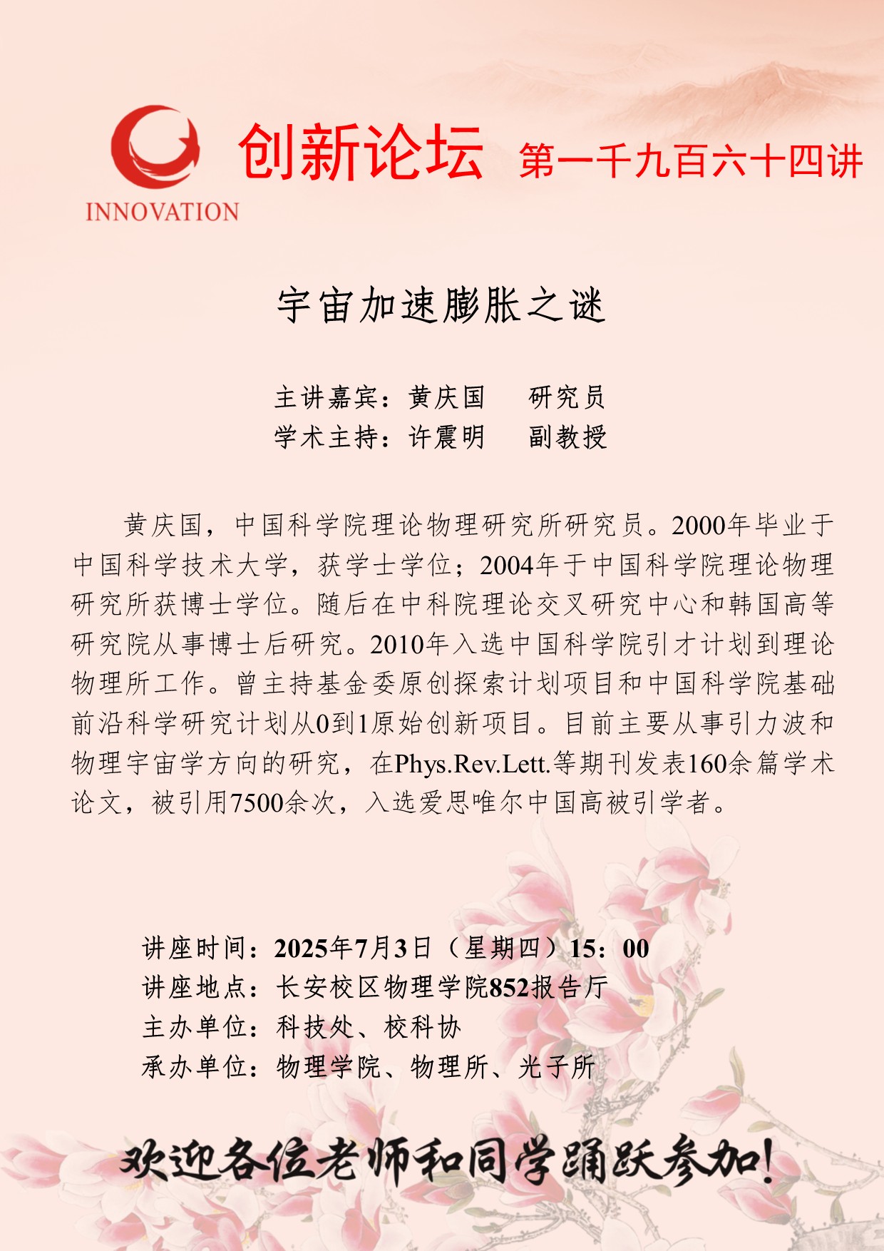黄庆国 研究员 九游会在线登录官网创新论坛第一千九百六十四讲:宇宙加速膨胀之谜 讲座时间 2025年7月3日(星期四)15:00 讲座地点 长安校区物理学院852报告厅 讲座人介绍 黄庆国 研究员 讲座内容