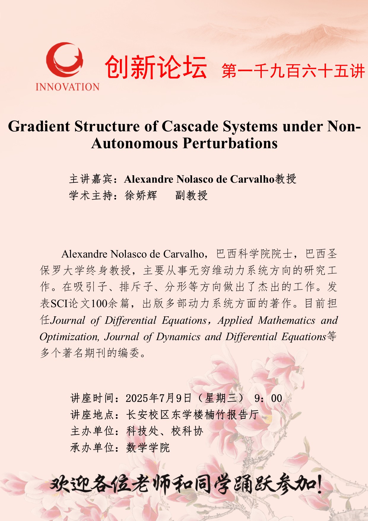 Alexandre Nolasco de Carvalho 教授 九游会在线登录官网创新论坛第一千九百六十五讲:Gradient Structure of Cascade Systems under Non-Autonomous Perturbations 讲座时间 2025年7月9日(星期三) 9:00 讲座地点 长安校区东学楼楠竹报告厅 讲座人介绍 Alexandre Nolasco de Carvalho 教授 讲座内容