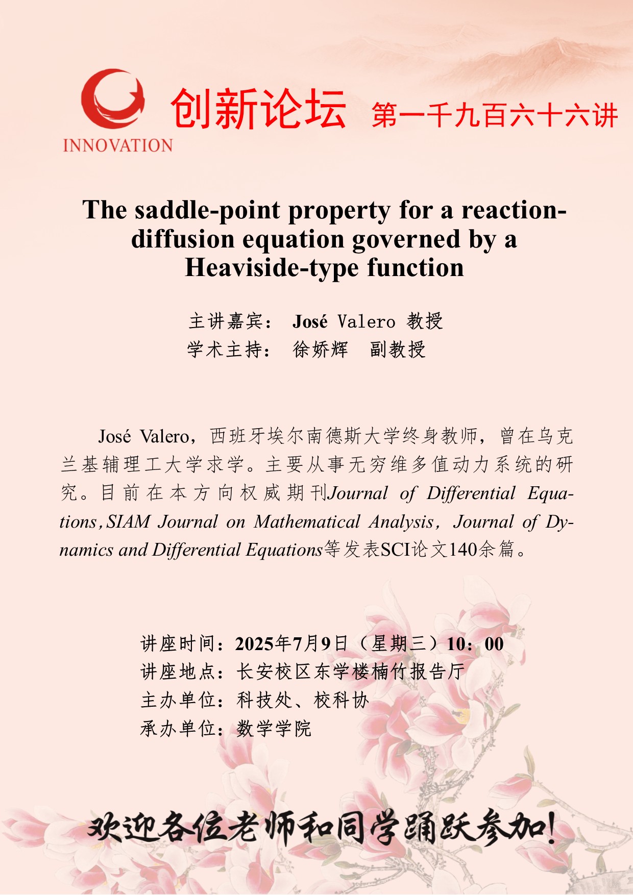 José Valero 教授 九游会在线登录官网创新论坛第一千九百六十六讲:The saddle-point property for a reaction-diffusion equation governed by a Heaviside-type function 讲座时间 2025年7月9日(星期三)10:00 讲座地点 长安校区东学楼楠竹报告厅 讲座人介绍 José Valero 教授 讲座内容