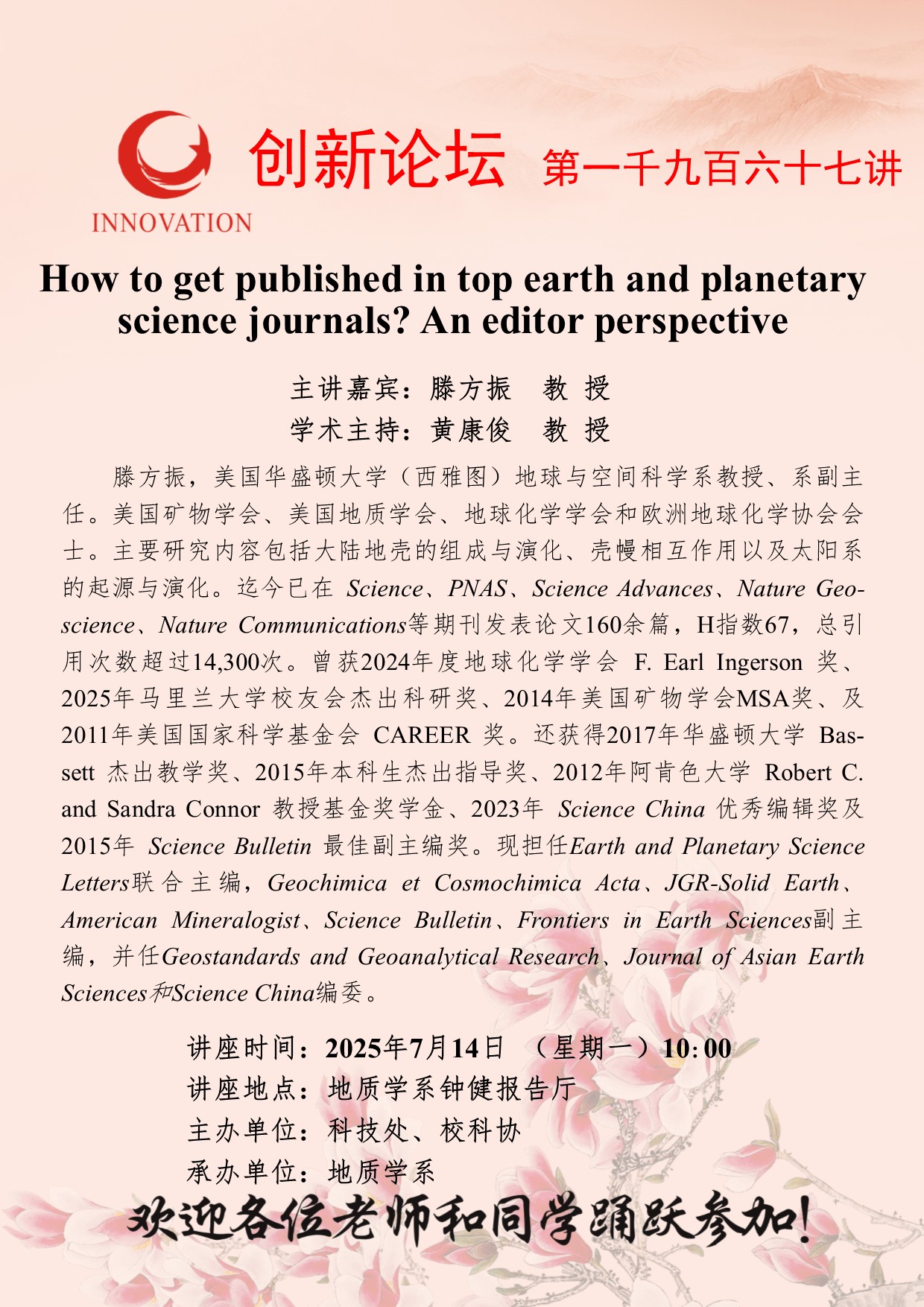 滕方振 教授 九游会在线登录官网创新论坛第一千九百六十七讲:How to get published in top earth and planetary science journals? An editor perspective 讲座时间 2025年7月14日 (星期一)10:00 讲座地点 地质学系钟健报告厅 讲座人介绍 滕方振 教授 讲座内容