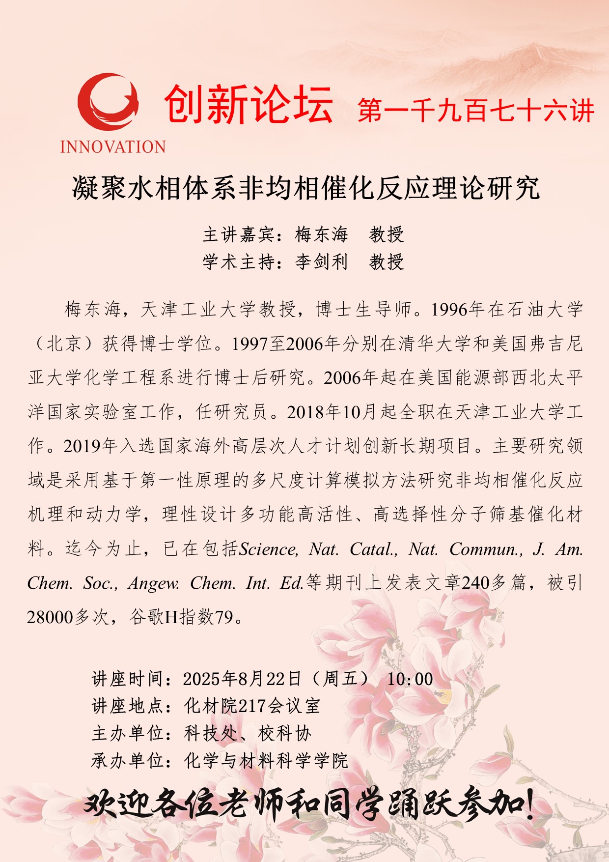 梅东海 教授 九游会在线登录官网创新论坛第一千九百七十六讲:凝聚水相体系非均相催化反应理论研究 讲座时间 2025年8月22日(星期五) 10:00 讲座地点 化材学院217智慧教室 讲座人介绍 梅东海 教授 讲座内容