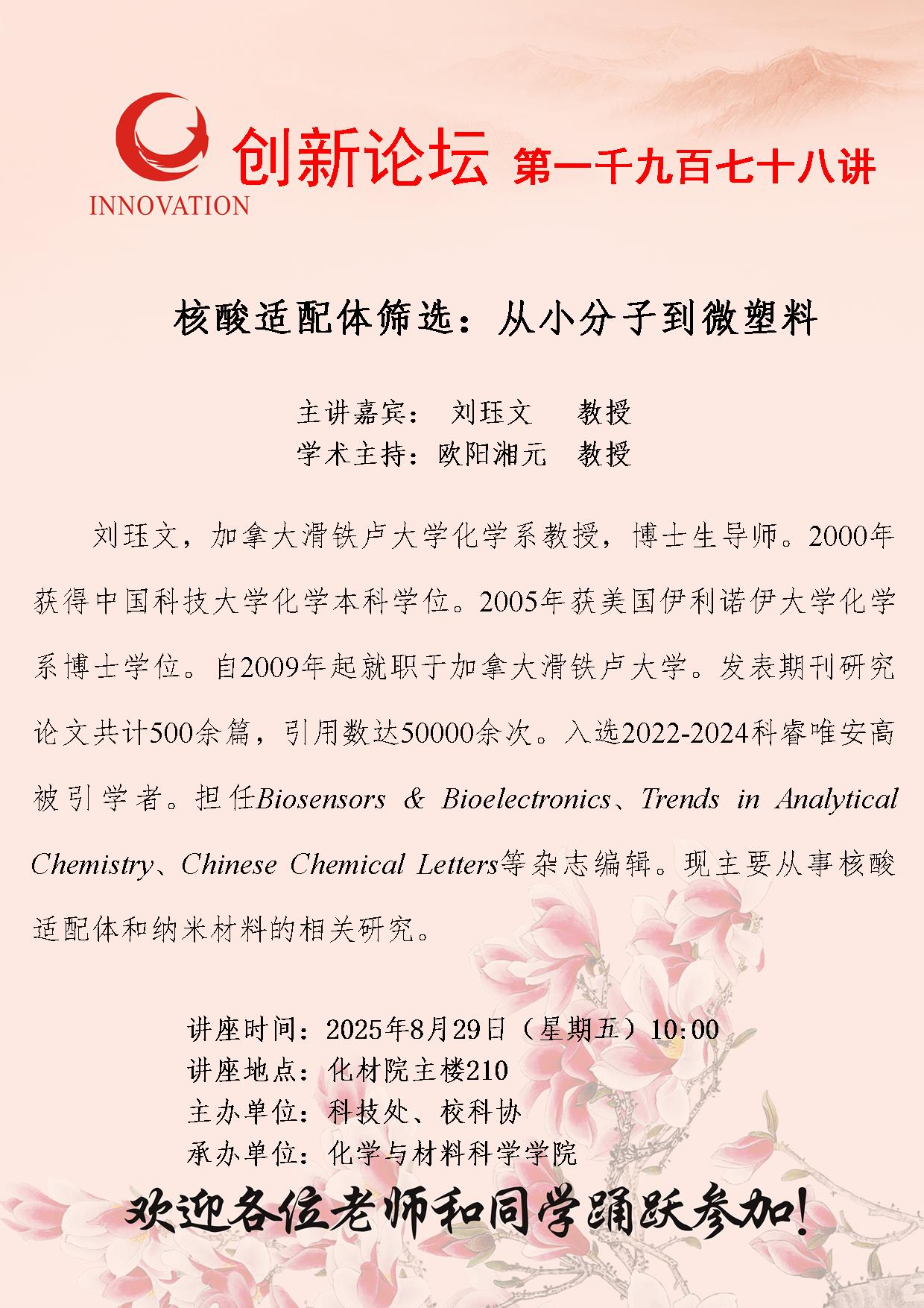 刘珏文 教授 九游会在线登录官网创新论坛第一千九百七十八讲:核酸适配体筛选:从小分子到微塑料 讲座时间 2025年8月29日(星期五)10:00 讲座地点 化材院主楼210 讲座人介绍 刘珏文 教授 讲座内容
