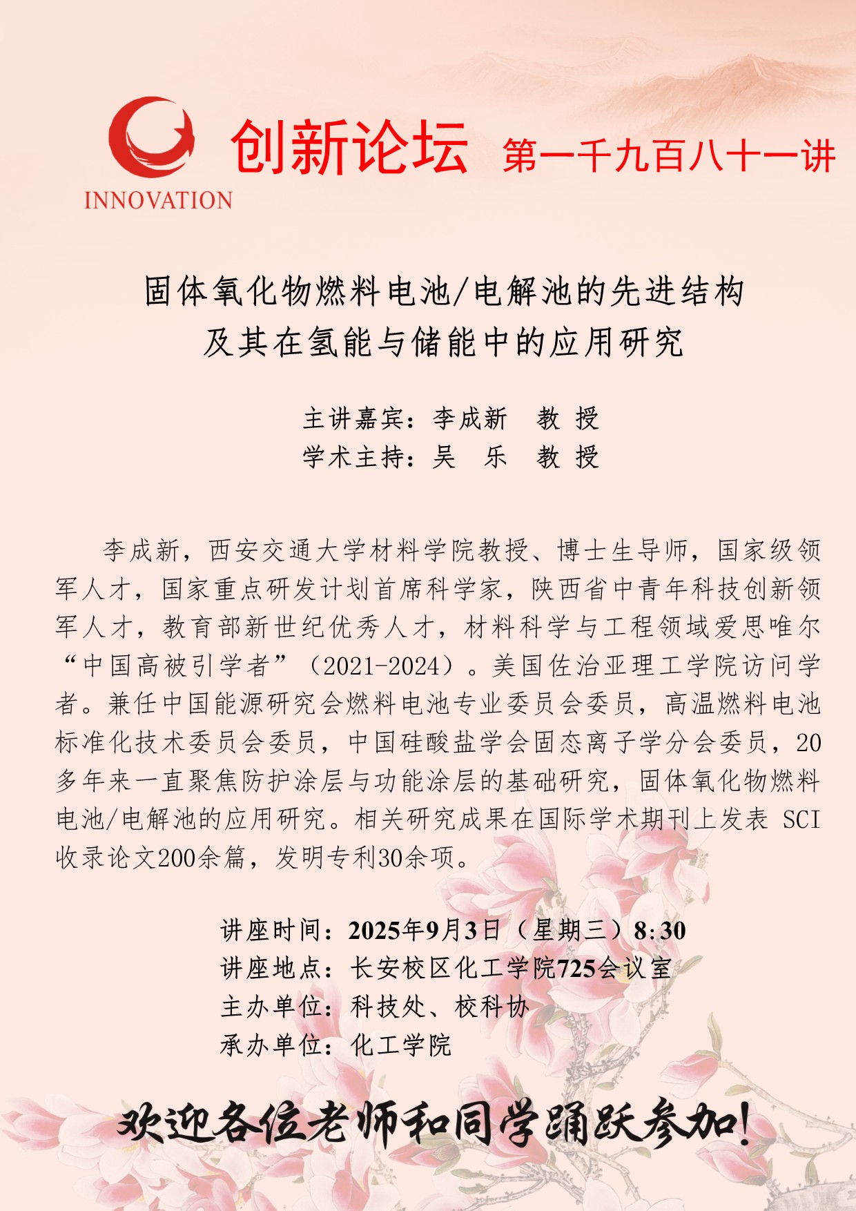 李成新 教授 九游会在线登录官网创新论坛第一千九百八十一讲:固体氧化物燃料电池/电解池的先进结构及其在氢能与储能中的应用研究 讲座时间 2025年9月3日(星期三)8:30 讲座地点 长安校区化工学院725会议室 讲座人介绍 李成新 教授 讲座内容