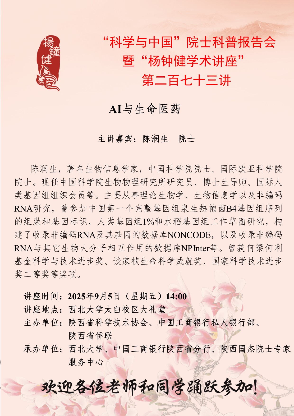 陈润生 院士 “科学与中国”院士科普报告会暨“杨钟健学术讲座”第二百七十三讲:AI与生命医药 讲座时间 2025年9月5日(星期五)14:00 讲座地点 九游会在线登录官网太白校区大礼堂 讲座人介绍 陈润生 院士 讲座内容