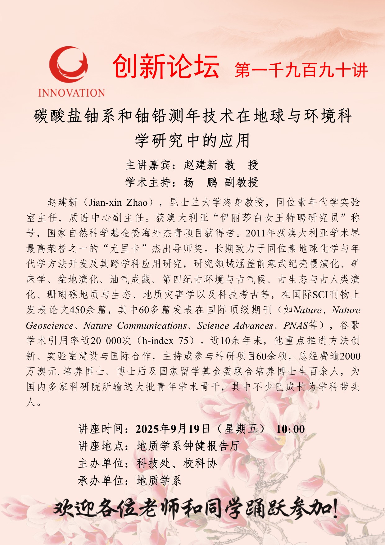赵建新 教授 九游会在线登录官网创新论坛第一千九百九十讲:碳酸盐铀系和铀铅测年技术在地球与环境科学研究中的应用 讲座时间 2025年9月19日(星期五) 10:00 讲座地点 地质学系钟健报告厅 讲座人介绍 赵建新 教授 讲座内容