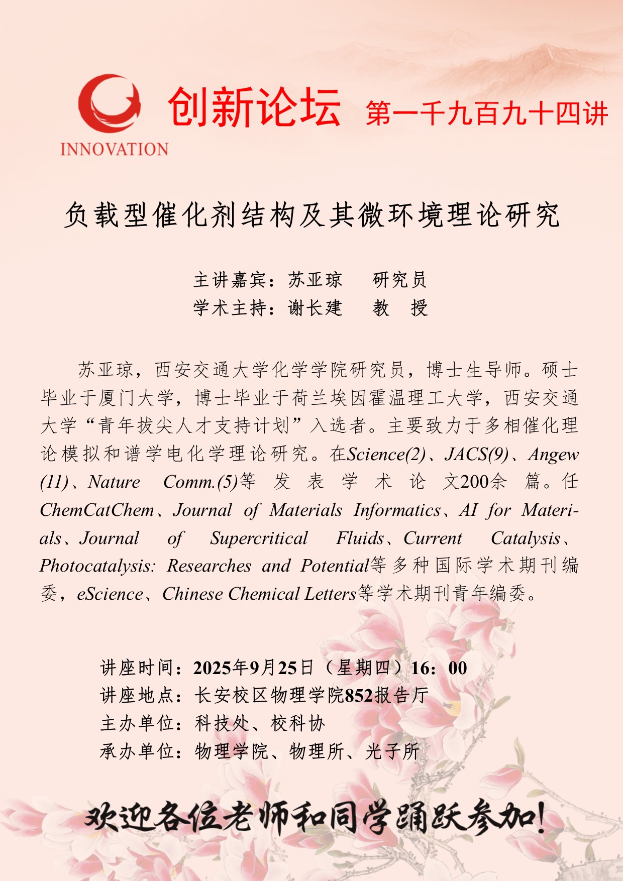 苏亚琼 研究员 九游会在线登录官网创新论坛第一千九百九十四讲:负载型催化剂结构及其微环境理论研究 讲座时间 2025年9月25日(星期四)16:00 讲座地点 长安校区物理学院852报告厅 讲座人介绍 苏亚琼 研究员 讲座内容
