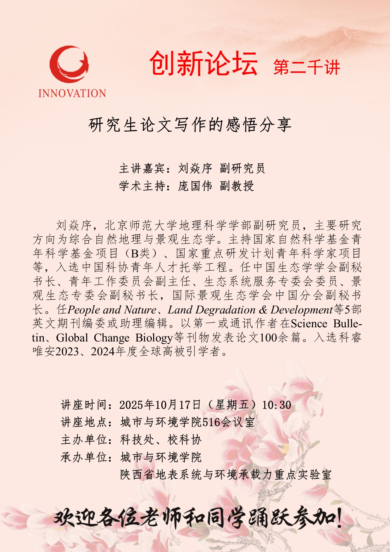 刘焱序 副研究员 九游会在线登录官网创新论坛第二千讲:研究生论文写作的感悟分享 讲座时间 2025年10月17日(星期五)10:30 讲座地点 城市与环境学院516会议室 讲座人介绍 刘焱序 副研究员 讲座内容