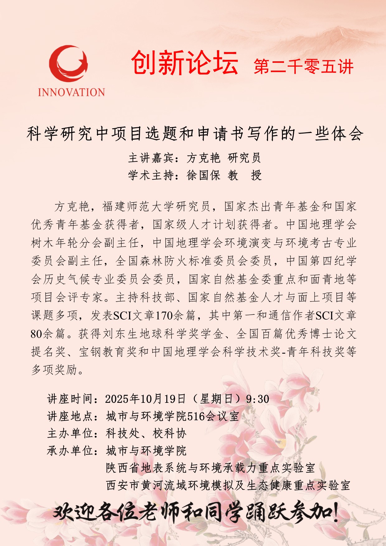 方克艳 研究员 九游会在线登录官网创新论坛第二千零五讲:科学研究中项目选题和申请书写作的一些体会 讲座时间 2025年10月19日(星期日)9:30 讲座地点 城市与环境学院516会议室 讲座人介绍 方克艳 研究员 讲座内容