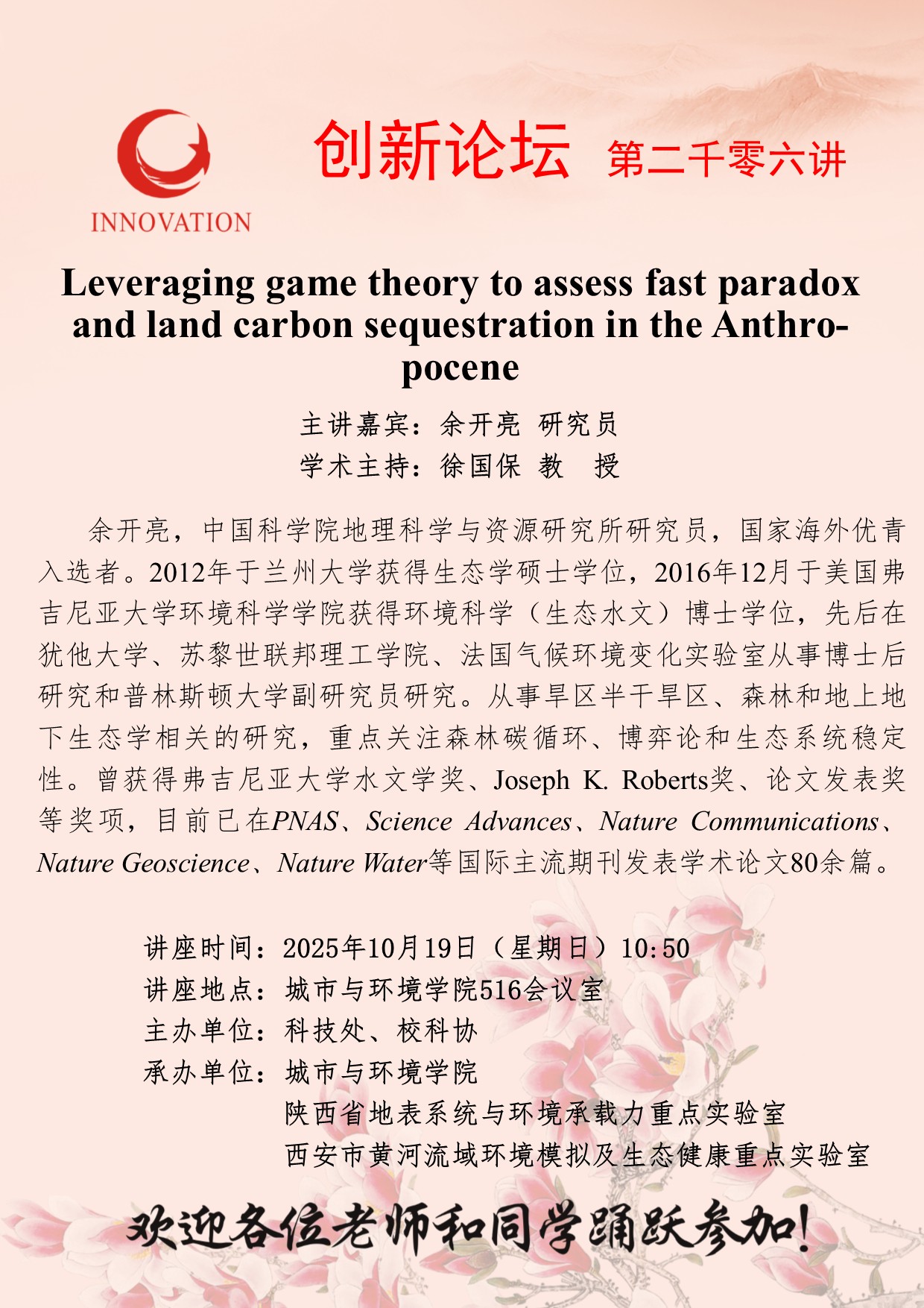 余开亮 研究员 九游会在线登录官网创新论坛第二千零六讲:Leveraging game theory to assess fast paradoxand land carbon sequestration in the Anthro-pocene 讲座时间 2025年10月19日(星期日)10:50 讲座地点 城市与环境学院516会议室 讲座人介绍 余开亮 研究员 讲座内容
