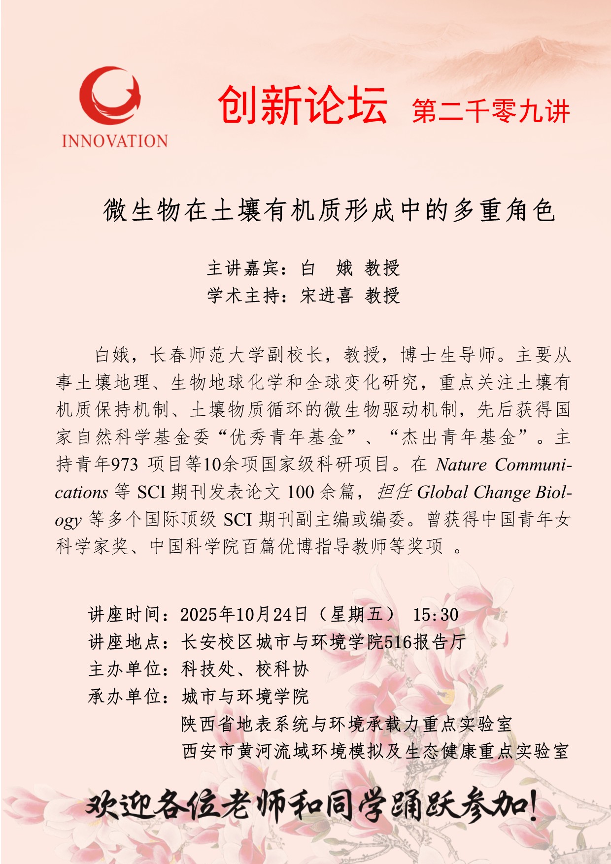 白娥 教授 九游会在线登录官网创新论坛第二千零九讲:微生物在土壤有机质形成中的多重角色 讲座时间 2025年10月24日(星期五) 15:30 讲座地点 长安校区城市与环境学院516报告厅 讲座人介绍 白娥 教授 讲座内容