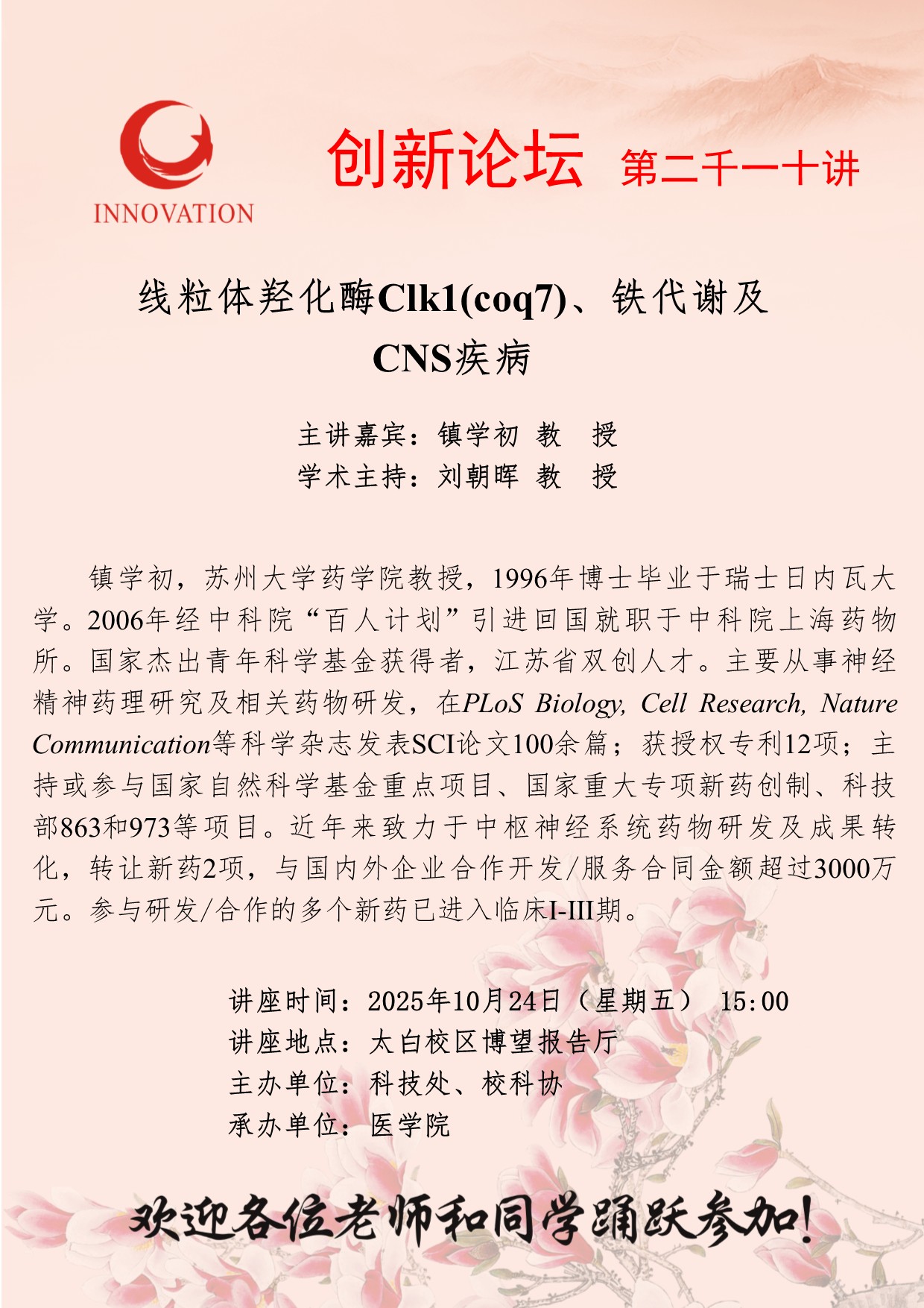 镇学初 教授 九游会在线登录官网创新论坛第二千一十讲:线粒体羟化酶Clk1(coq7)、铁代谢及CNS疾病 讲座时间 2025年10月24日(星期五) 15:00 讲座地点 太白校区博望报告厅 讲座人介绍 镇学初 教授 讲座内容
