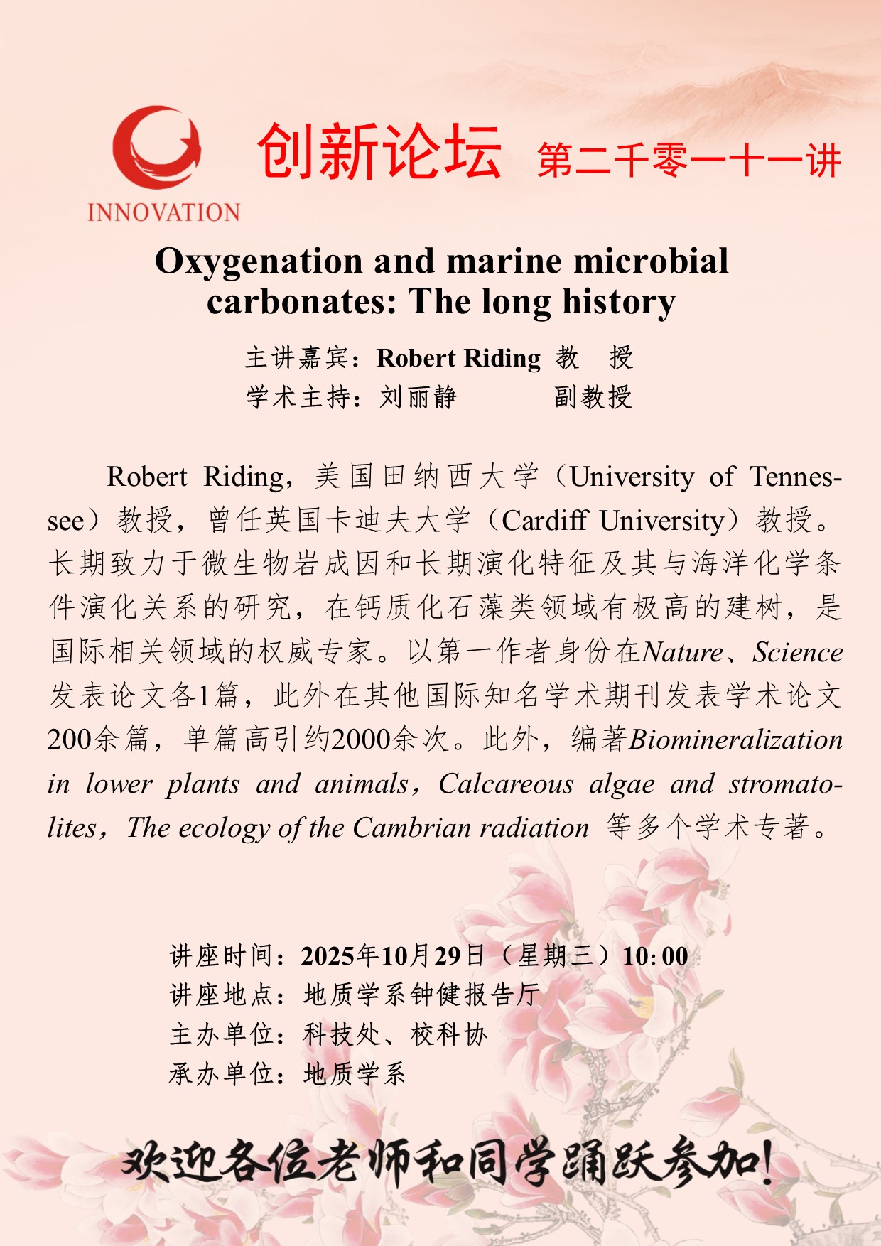 Robert Riding 教授 九游会在线登录官网创新论坛第二千零一十一讲:Oxygenation and marine microbial carbonates: The long history 讲座时间 2025年10月29日(星期三)10:00 讲座地点 地质学系钟健报告厅 讲座人介绍 Robert Riding 教授 讲座内容