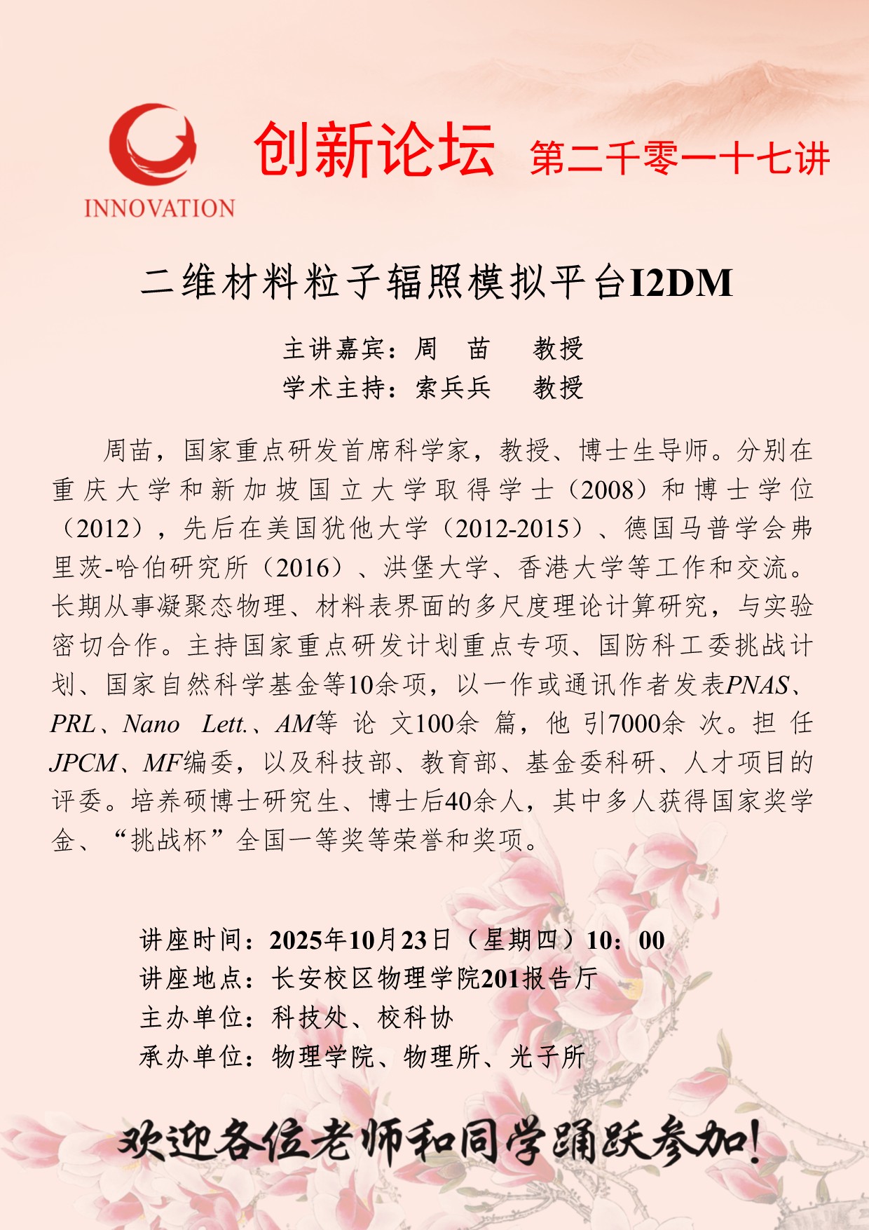 周苗 教授 九游会在线登录官网创新论坛第二千零一十七讲:二维材料粒子辐照模拟平台I2DM 讲座时间 2025年10月23日(星期四)10:00 讲座地点 长安校区物理学院201报告厅 讲座人介绍 周苗 教授 讲座内容