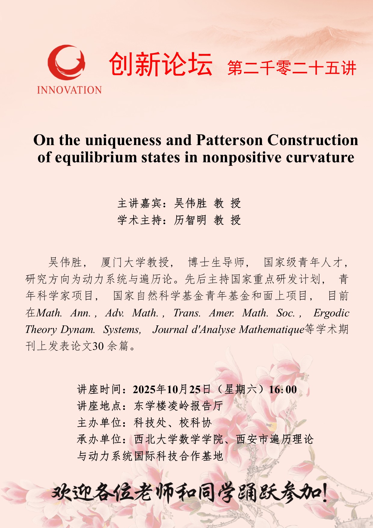 吴伟胜 教 授 九游会在线登录官网创新论坛第二千零二十五讲:On the uniqueness and Patterson Construction of equilibrium states in nonpositive curvature 讲座时间 2025年10月25日(星期六)16:00 讲座地点 东学楼凌岭报告厅 讲座人介绍 吴伟胜 教 授 讲座内容