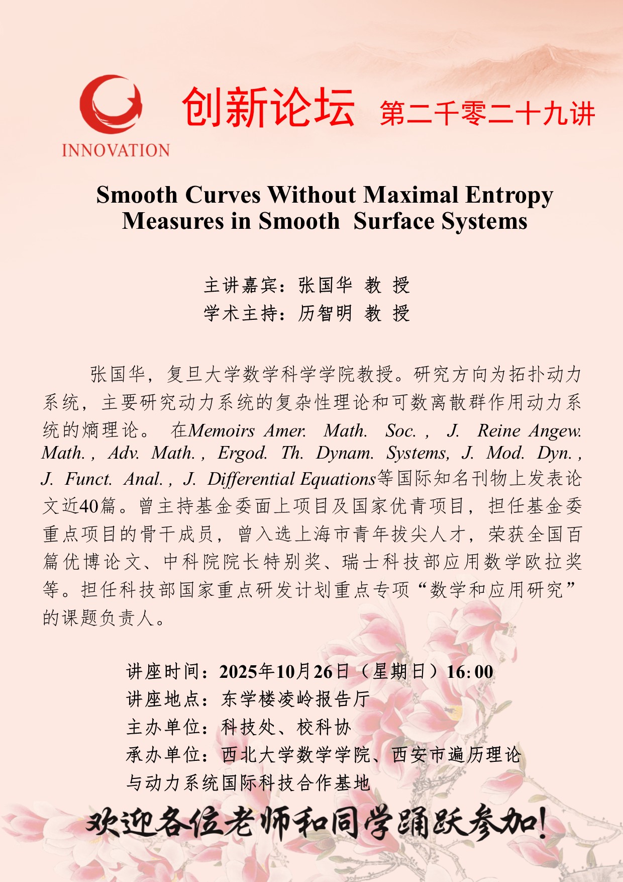 张国华 教 授 九游会在线登录官网创新论坛第二千零二十九讲:Smooth Curves Without Maximal Entropy Measures in Smooth Surface Systems 讲座时间 2025年10月26日(星期日)16:00 讲座地点 东学楼凌岭报告厅 讲座人介绍 张国华 教 授 讲座内容