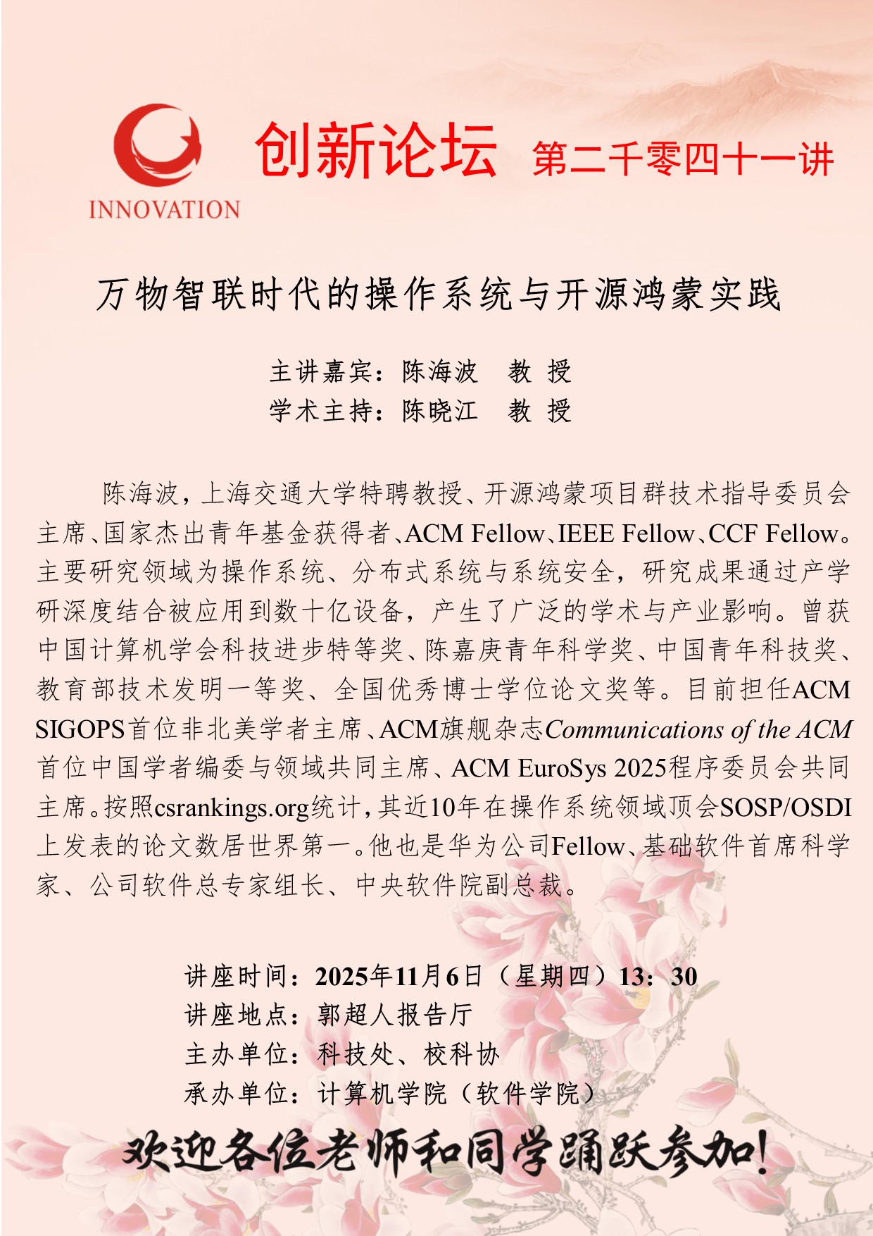 陈海波 教授 九游会在线登录官网创新论坛第二千零四十一讲:万物智联时代的操作系统与开源鸿蒙实践 讲座时间 2025年11月6日(星期四)13:30 讲座地点 郭超人报告厅 讲座人介绍 陈海波 教授 讲座内容