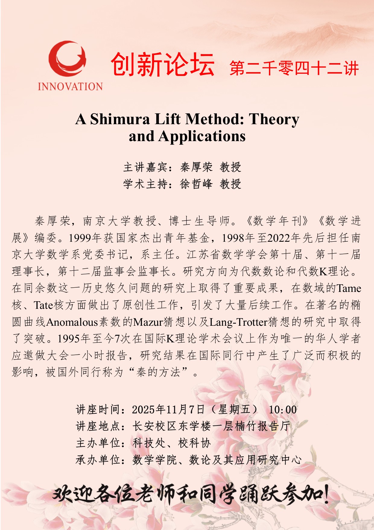 秦厚荣 教授 九游会在线登录官网创新论坛第二千零四十二讲:A Shimura Lift Method: Theory and Applications 讲座时间 2025年11月7日(星期五) 10:00 讲座地点 长安校区东学楼一层楠竹报告厅 讲座人介绍 秦厚荣 教授 讲座内容
