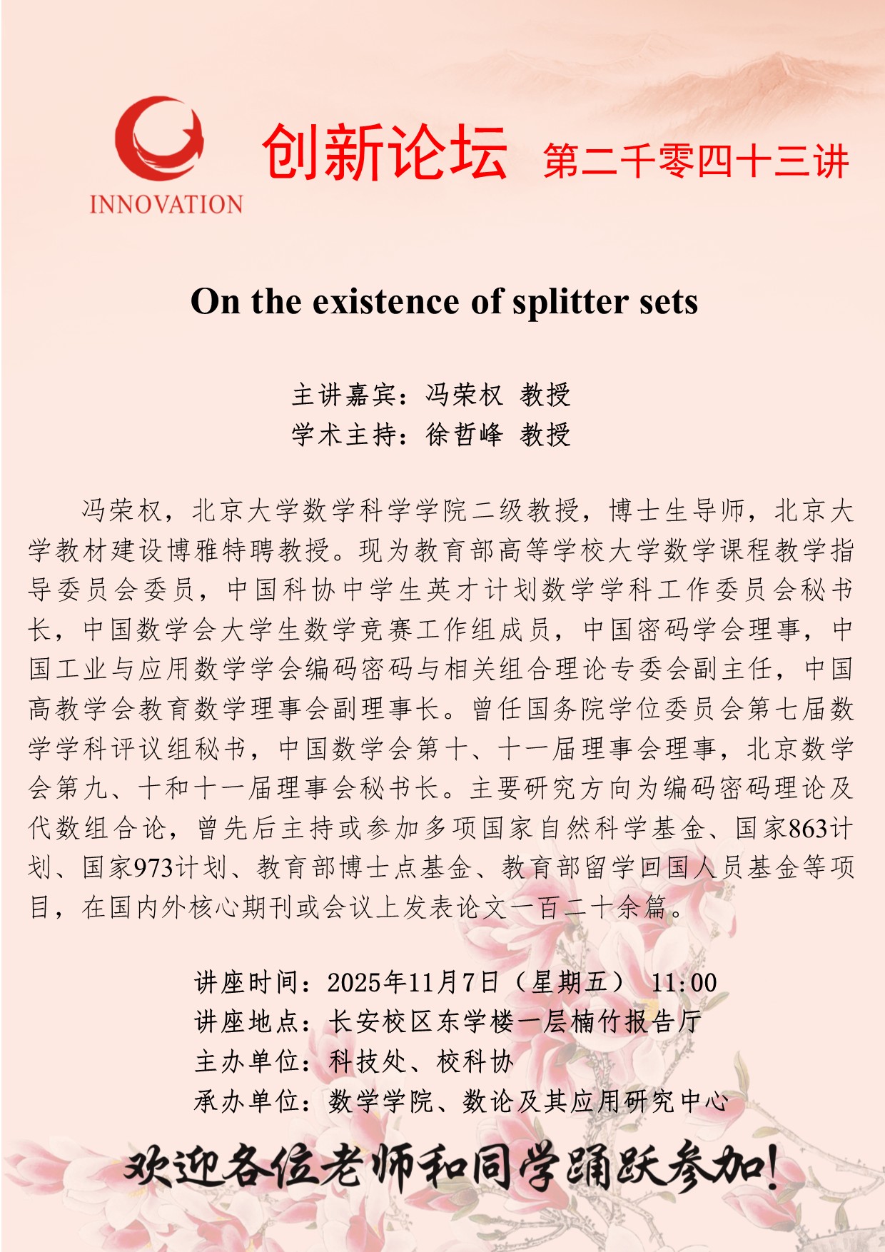 冯荣权 教授 九游会在线登录官网创新论坛第二千零四十三讲:On the existence of splitter sets 讲座时间 2025年11月7日(星期五) 11:00 讲座地点 长安校区东学楼一层楠竹报告厅 讲座人介绍 冯荣权 教授 讲座内容