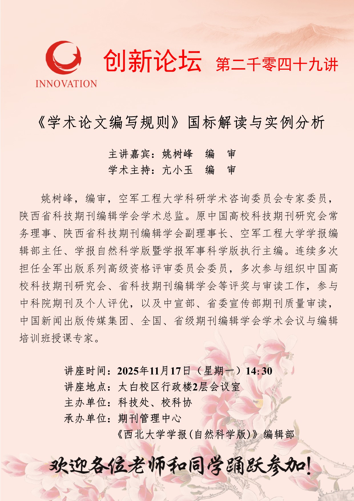 姚树峰 编审 九游会在线登录官网创新论坛第二千零四十九讲:《学术论文编写规则》国标解读与实例分析 讲座时间 2025年11月17日(星期一)14:30 讲座地点 太白校区行政楼2层会议室 讲座人介绍 姚树峰 编审 讲座内容