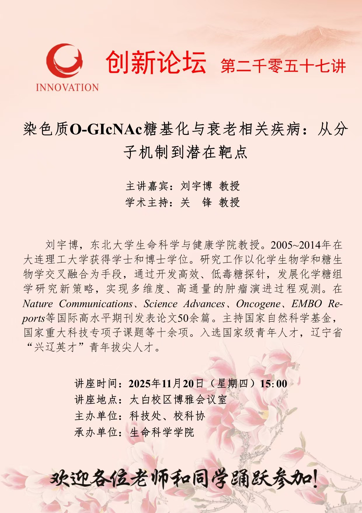 刘宇博 教授 九游会在线登录官网创新论坛第二千零五十七讲:染色质O-GIcNAc糖基化与衰老相关疾病:从分子机制到潜在靶点 讲座时间 2025年11月20日(星期四)15:00 讲座地点 太白校区博雅会议室 讲座人介绍 刘宇博 教授 讲座内容