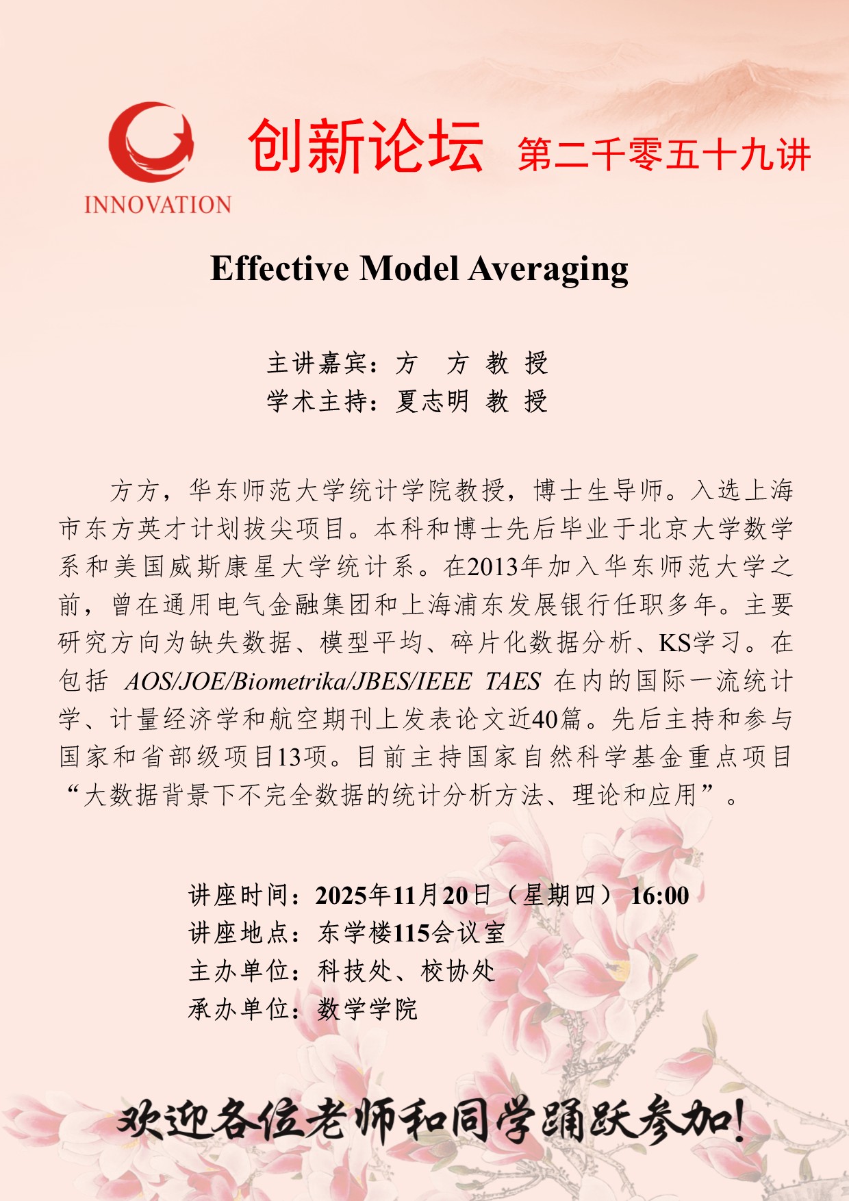 方方 教授 九游会在线登录官网创新论坛第二千零五十九讲:Effective Model Averaging 讲座时间 2025年11月20日(星期四) 16:00 讲座地点 东学楼115会议室 讲座人介绍 方方 教授 讲座内容