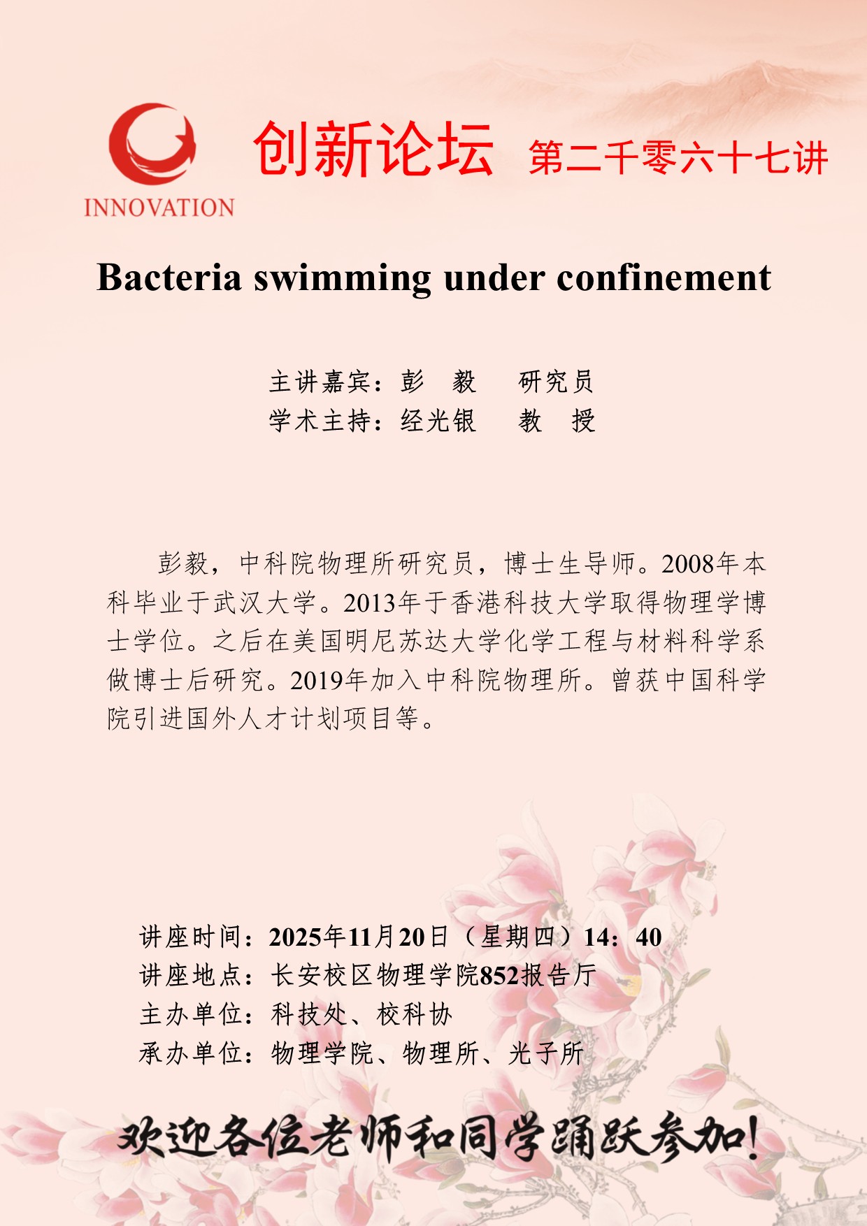 彭毅 研究员 九游会在线登录官网创新论坛第二千零六十七讲:Bacteria swimming under confinement 讲座时间 2025年11月20日(星期四)14:40 讲座地点 长安校区物理学院852报告厅 讲座人介绍 彭毅 研究员 讲座内容