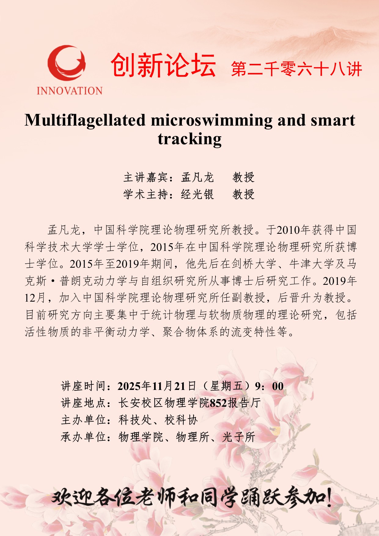 孟凡龙 教授 九游会在线登录官网创新论坛第二千零六十八讲:Multiflagellated microswimming and smart tracking 讲座时间 2025年11月21日(星期五)9:00 讲座地点 长安校区物理学院852报告厅 讲座人介绍 孟凡龙 教授 讲座内容