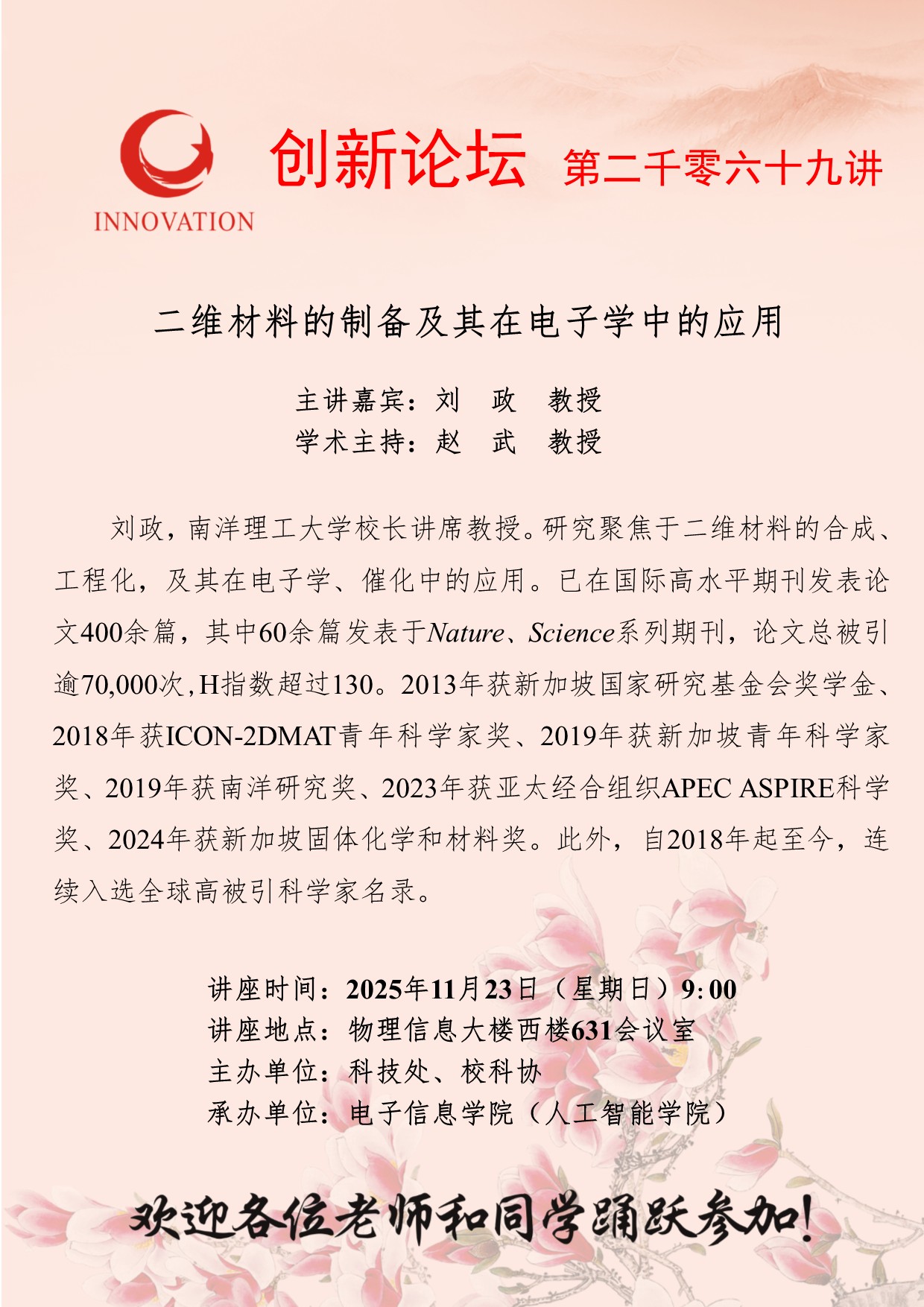 刘政 教授 九游会在线登录官网创新论坛第二千零六十九讲:二维材料的制备及其在电子学中的应用 讲座时间 2025年11月23日(星期日)9:00 讲座地点 物理信息大楼西楼631会议室 讲座人介绍 刘政 教授 讲座内容