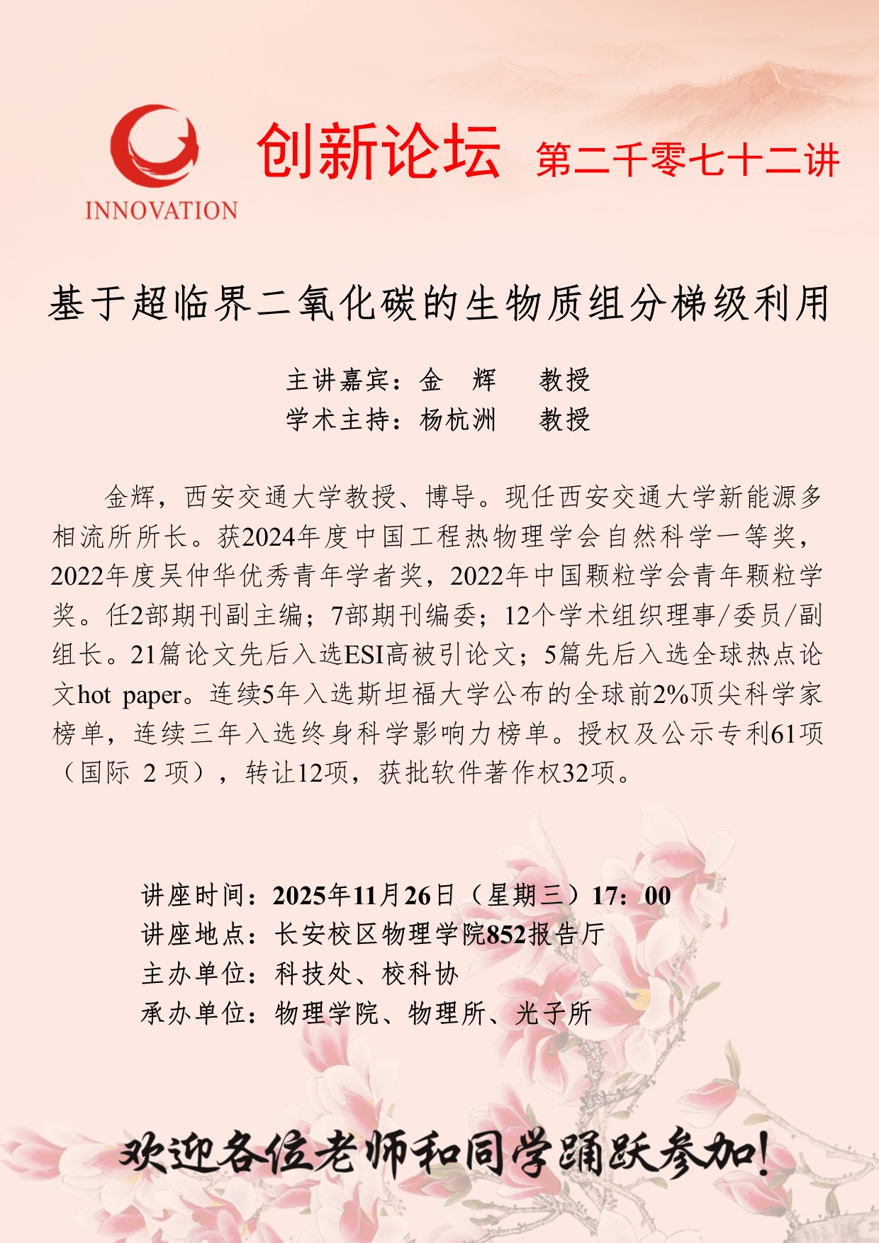 金辉 教授 九游会在线登录官网创新论坛第二千零七十二讲:基于超临界二氧化碳的生物质组分梯级利用 讲座时间 2025年11月26日(星期三)17:00 讲座地点 长安校区物理学院852报告厅 讲座人介绍 金辉 教授 讲座内容
