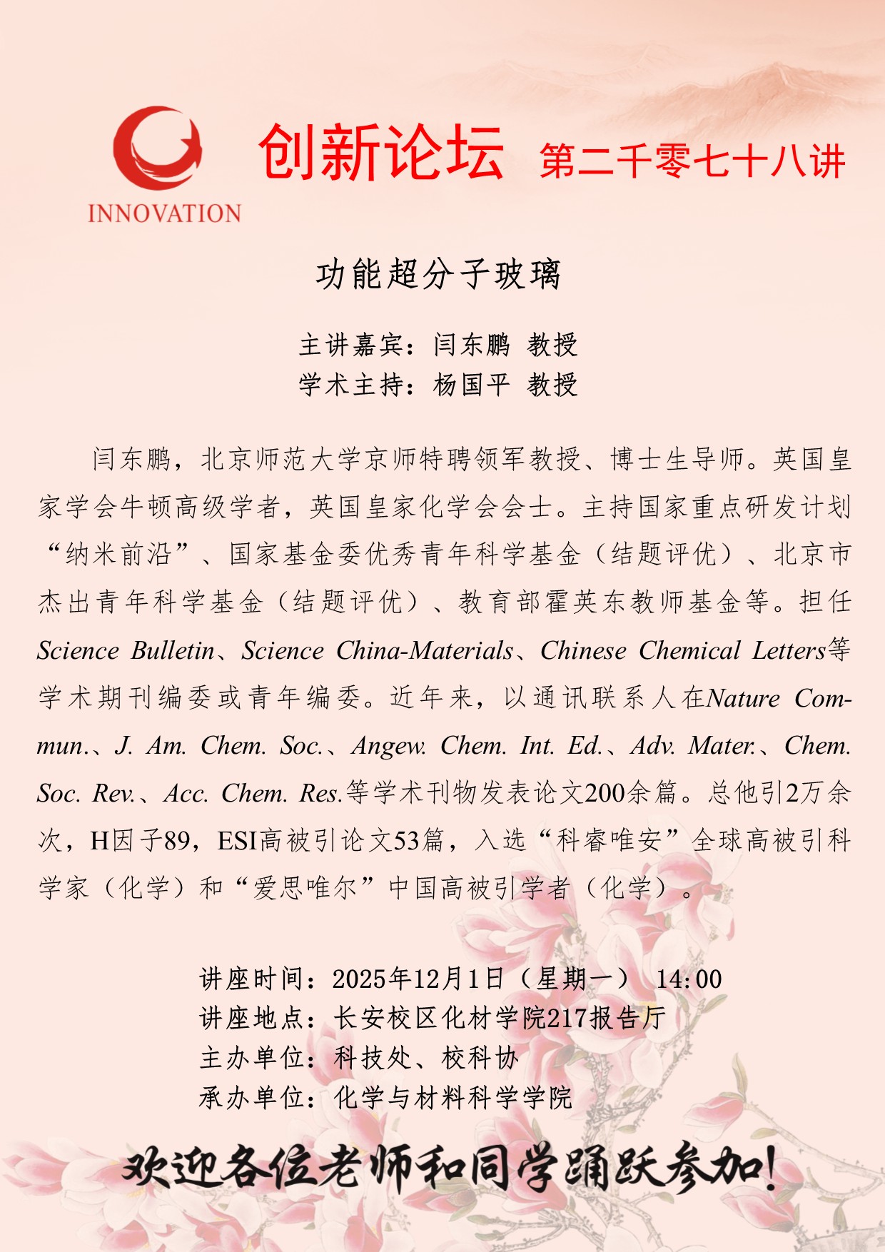 闫东鹏 教授 九游会在线登录官网创新论坛第二千零七十八讲:功能超分子玻璃 讲座时间 2025年12月1日(星期一) 14:00 讲座地点 长安校区化材学院217报告厅 讲座人介绍 闫东鹏 教授 讲座内容