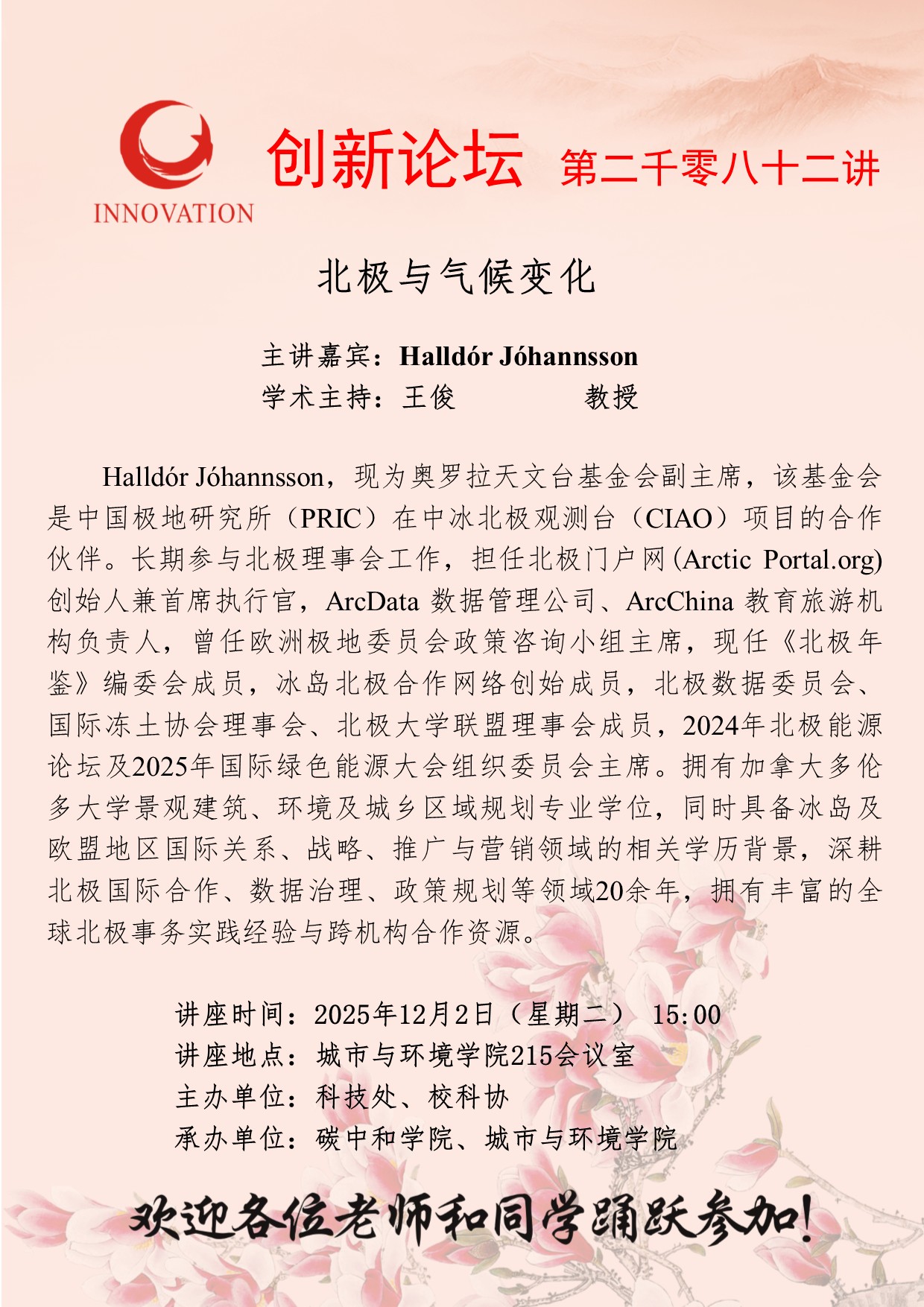 Halldór Jóhannsson 九游会在线登录官网创新论坛第二千零八十二讲:北极与气候变化 讲座时间 2025年12月2日(星期二) 15:00 讲座地点 城市与环境学院215会议室 讲座人介绍 Halldór Jóhannsson 讲座内容