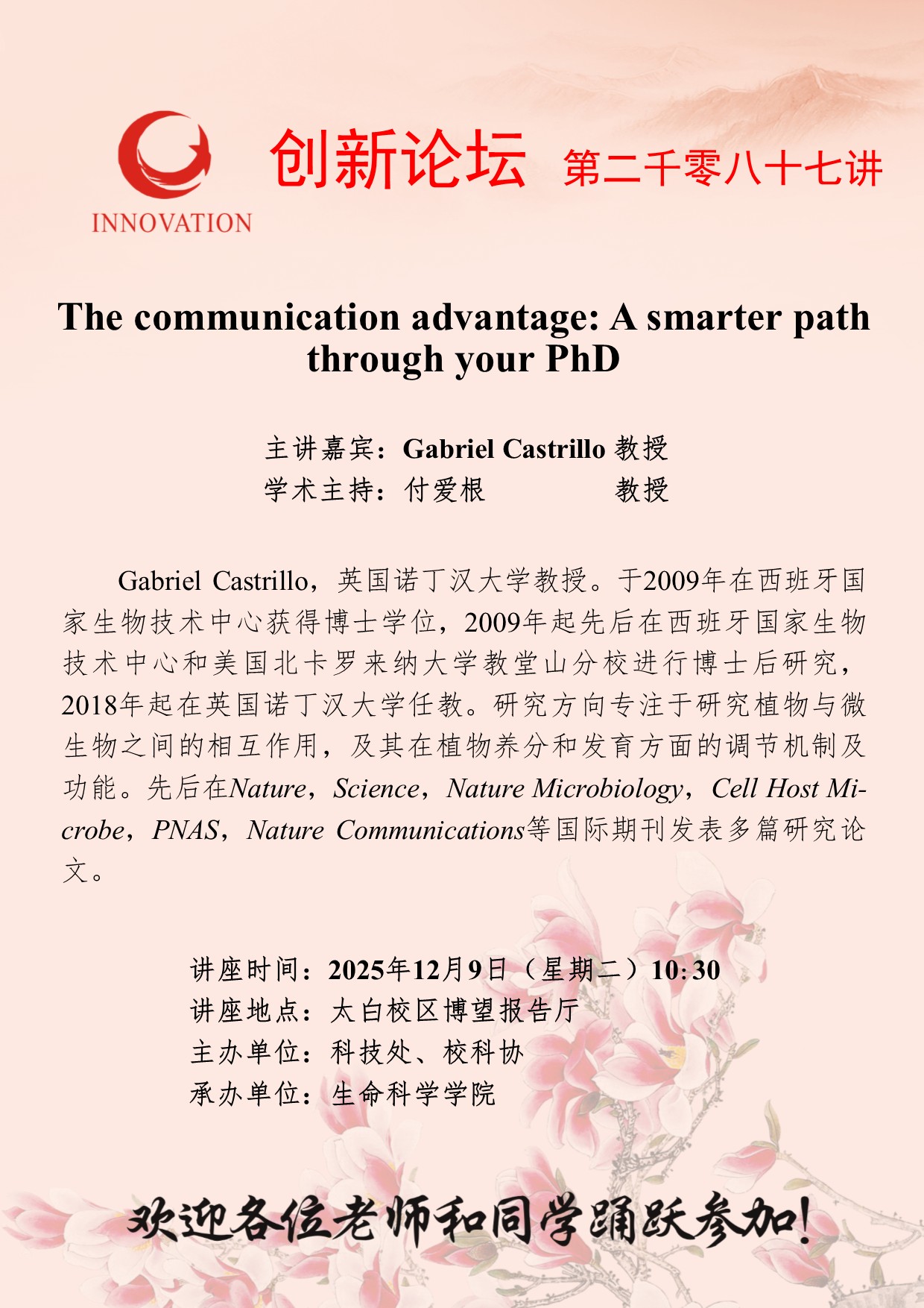 Gabriel Castrillo 教授 九游会在线登录官网创新论坛第二千零八十七讲:The communication advantage: A smarter path through your PhD 讲座时间 2025年12月9日(星期二)10:30 讲座地点 太白校区博望报告厅 讲座人介绍 Gabriel Castrillo 教授 讲座内容