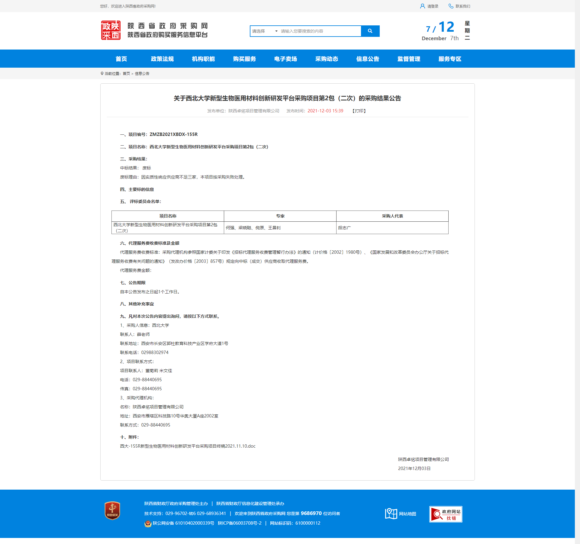 关于九游会在线登录官网新型生物医用材料创新研发平台采购项目第2包(二次)的采购结果公告 作者: 编辑:薛利娟 时间:2021-12-07 原公告链接:http://www.ccgp-shaanxi.gov.cn/notice/noticeDetail.do?noticeguid=8a85be347d6a75c8017d7f38c86a62bc