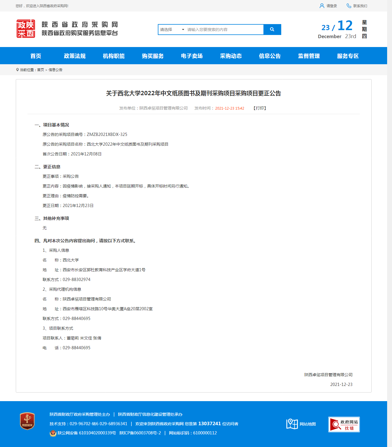 关于九游会在线登录官网2022年中文纸质图书及期刊采购项目采购项目更正公告 作者: 编辑:薛利娟 时间:2021-12-23 原公告链接:http://www.ccgp-shaanxi.gov.cn/notice/noticeDetail.do?noticeguid=8a85be327dace5d8017de63c777e2f27