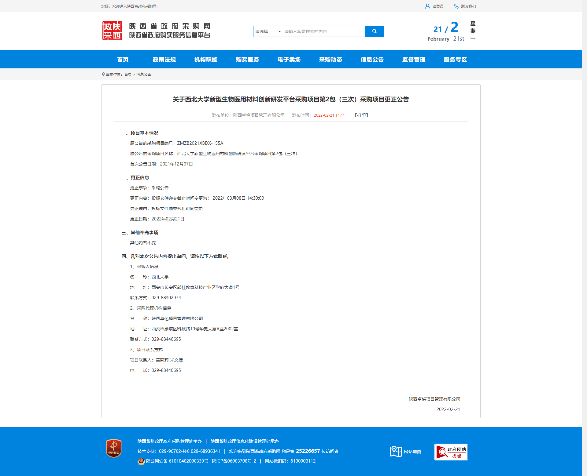 关于九游会在线登录官网新型生物医用材料创新研发平台采购项目第2包(三次)采购项目更正公告 作者: 编辑:薛利娟 时间:2022-02-21 原公告链接:http://www.ccgp-shaanxi.gov.cn/notice/noticeDetail.do?noticeguid=8a85be317ee7907d017f1a9fc1d146e6