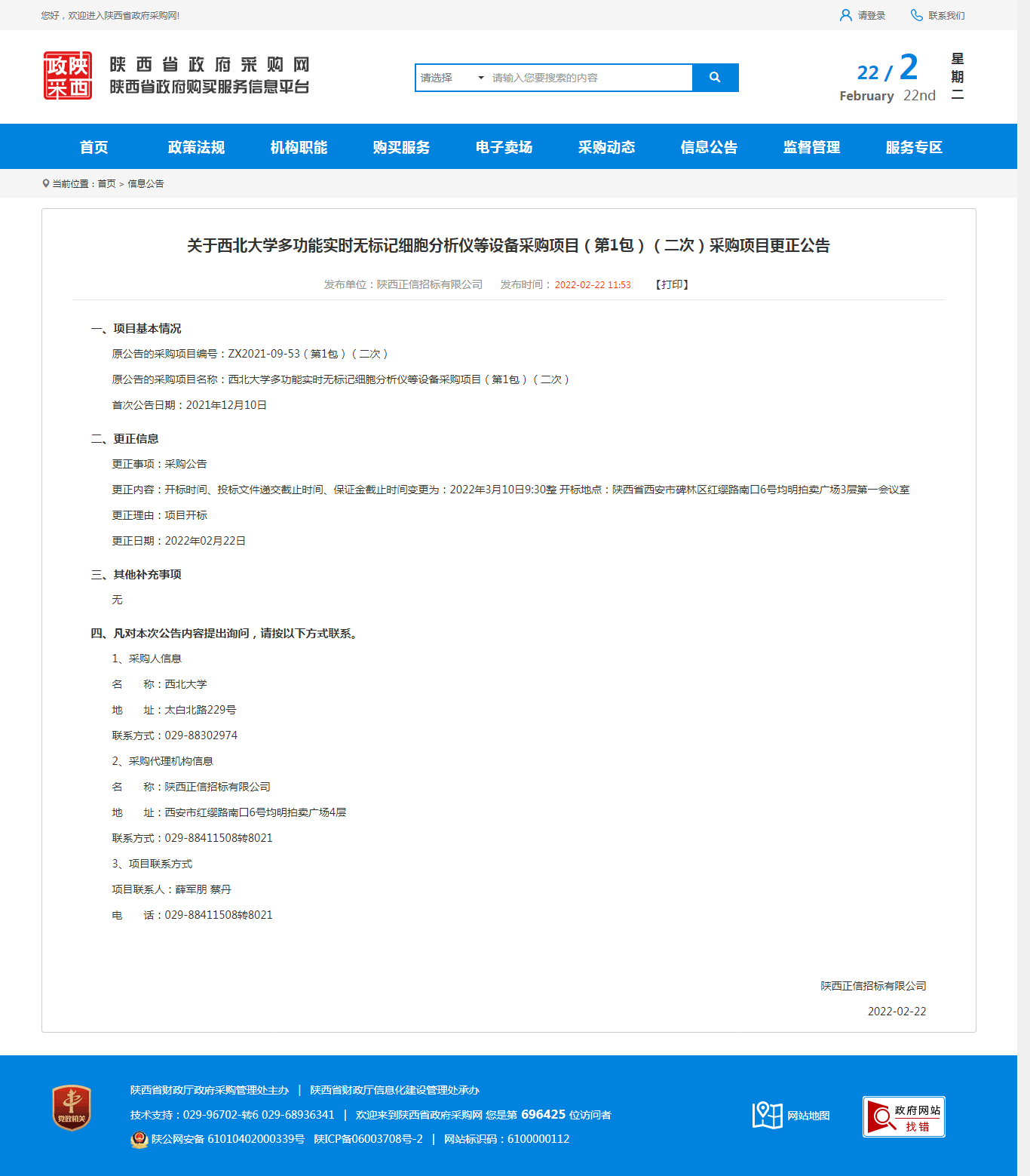 关于九游会在线登录官网多功能实时无标记细胞分析仪等设备采购项目(第1包)(二次)采购项目更正公告 作者: 编辑:薛利娟 时间:2022-02-22 原公告链接:http://www.ccgp-shaanxi.gov.cn/notice/noticeDetail.do?noticeguid=8a85be337ee79f03017f1f88974a78b8