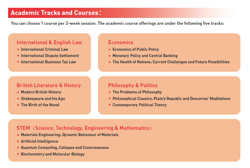 暑期课程开放课程广泛,提供600多门课程,包括哈斯商学院的课程、经济学、政治、数理类、工程类、人文艺术类等热门专业课程,每期参课学生可选择3门课程,学生可以自由选择一期或多期(3-12周)课程学习: