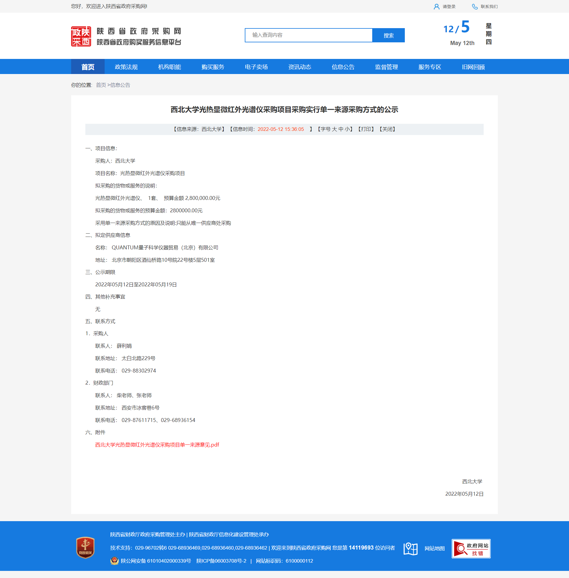 九游会在线登录官网光热显微红外光谱仪采购项目采购实行单一来源采购方式的公示 作者: 编辑:薛利娟 时间:2022-05-12 原公告链接:http://www.ccgp-shaanxi.gov.cn/freecms/site/shaanxi/ggxx/info/2022/8a69c0c980b0a61b0180b723a9b03d17.html?noticeType=001051¬iceId=6429ac2f-d1c6-11ec-9a8e-08c0eb20c666