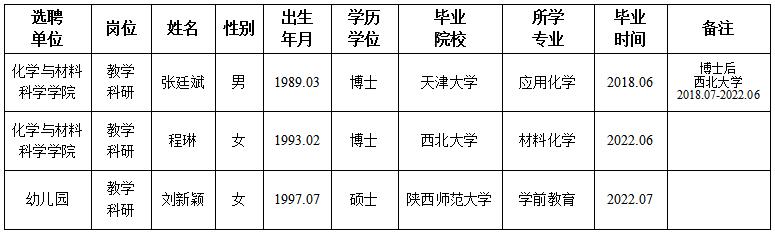 经用人单位及教学督导考核、学校研究,拟同意选聘下列人员来校工作,其聘任关系为A类人事代理。本着公平、公正、公开的原则,现将拟选聘人员基本情况公示如下: