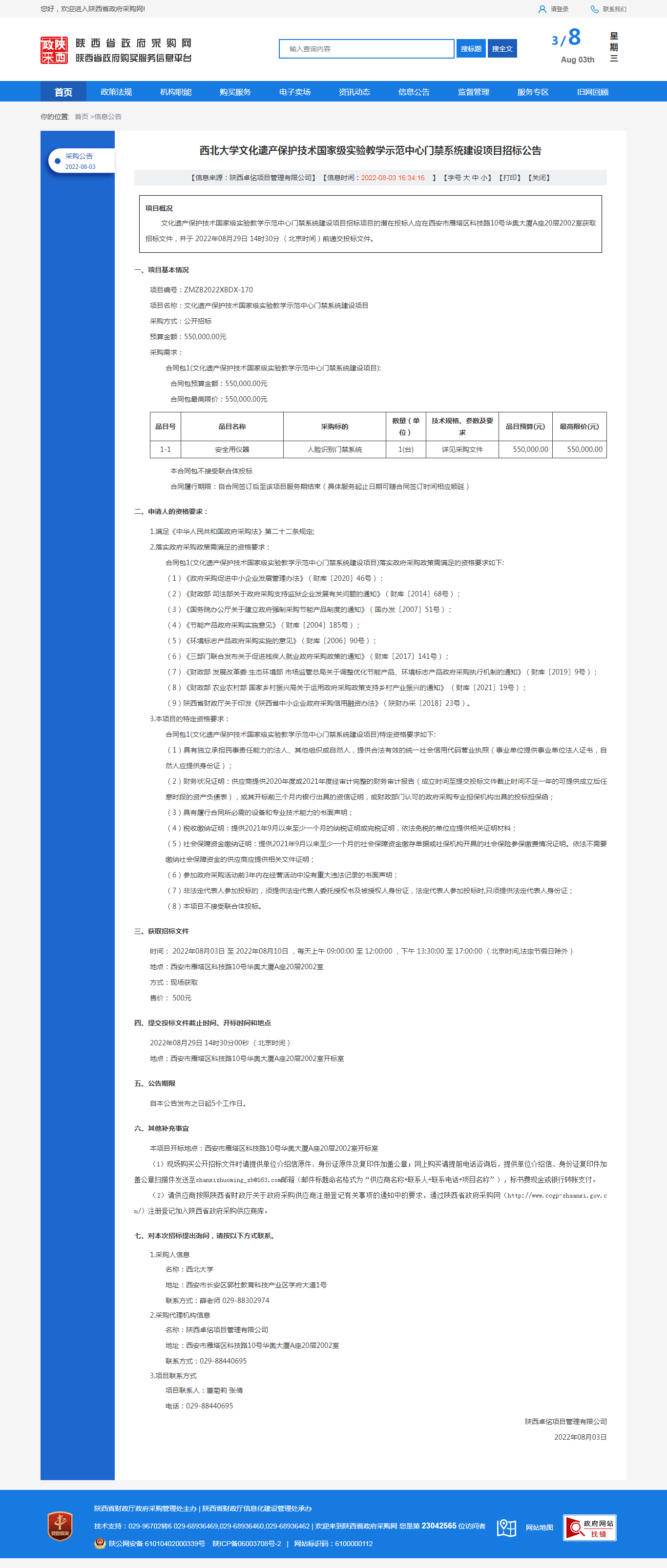 九游会在线登录官网文化遗产保护技术国家级实验教学示范中心门禁系统建设项目招标公告 作者: 编辑:采购与招标办公室 时间:2022-08-03 原公告链接:http://www.ccgp-shaanxi.gov.cn/freecms/site/shaanxi/ggxx/info/2022/8a69c15f8238f00c01826158874944be.html?noticeType=001011¬iceId=795f6845-1307-11ed-9a8e-08c0eb20c666