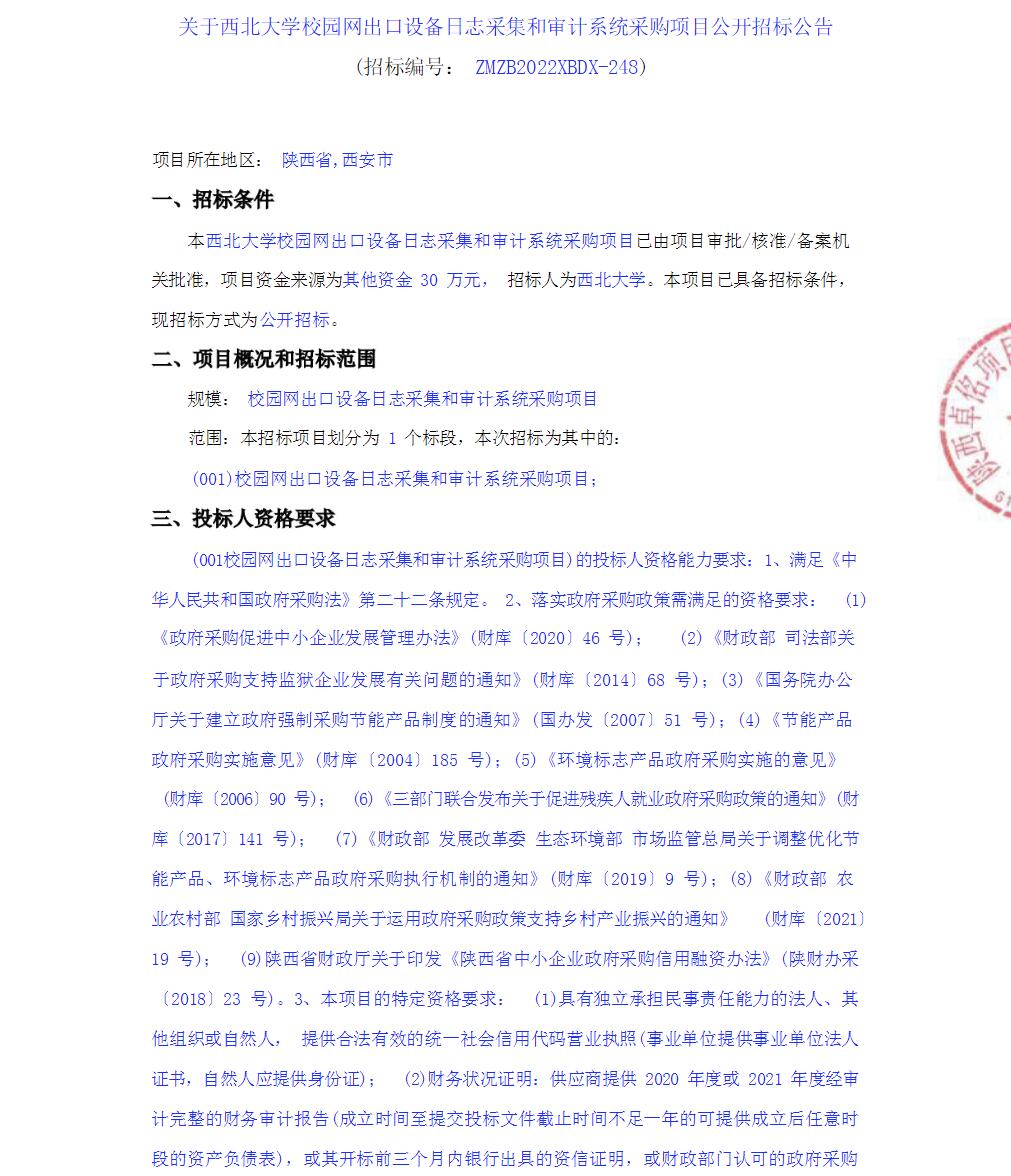 关于九游会在线登录官网校园网出口设备日志采集和审计系统采购项目公开招标公告