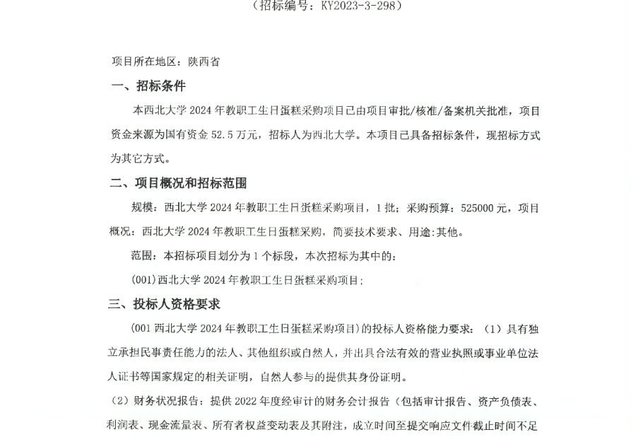 九游会在线登录官网2024年教职工生日蛋糕采购项目竞争性磋商公告 作者: 编辑:采购与招标办公室 时间:2023-11-27 原公告链接:http://bulletin.sntba.com/biddingBulletin/2023-11-27/855167.html