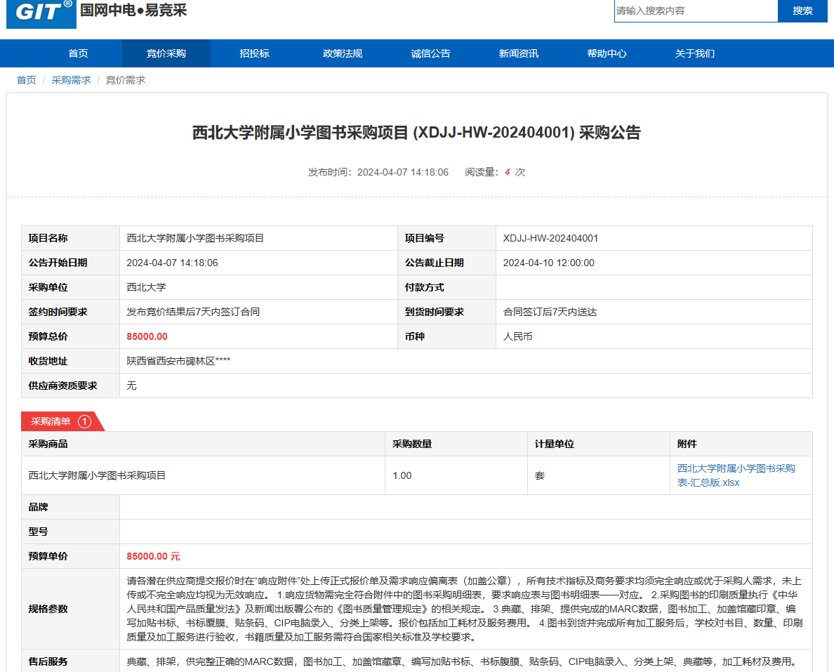 九游会在线登录官网附属小学图书采购项目 (XDJJ-HW-202404001) 竞价公告 作者: 编辑: 时间:2024-04-07 原公告链接:https://www.ejingcai.com.cn/site/bidding/detail/9303