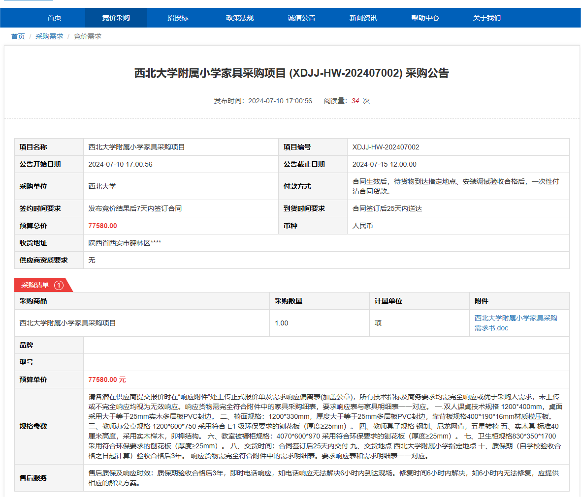 九游会在线登录官网附属小学家具采购项目 (XDJJ-HW-202407002) 竞价采购公告 作者: 编辑: 时间:2024-07-11 原公告链接:https://www.ejingcai.com.cn/site/bidding/detail/11607