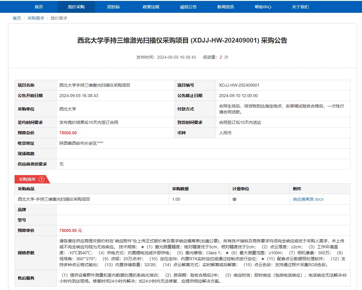 九游会在线登录官网手持三维激光扫描仪采购项目 (XDJJ-HW-202409001) 竞价采购公告 作者: 编辑: 时间:2024-09-05 原公告链接:https://www.ejingcai.com.cn/site/bidding/detail/12357