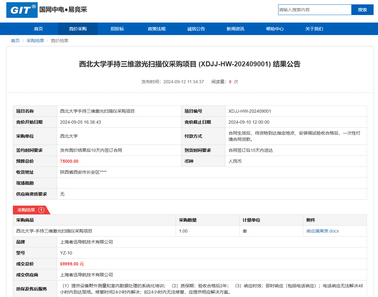 九游会在线登录官网手持三维激光扫描仪采购项目 (XDJJ-HW-202409001)竞价结果公告 作者: 编辑: 时间:2024-09-12 原公告链接:https://www.ejingcai.com.cn/site/bidding/detail/12516